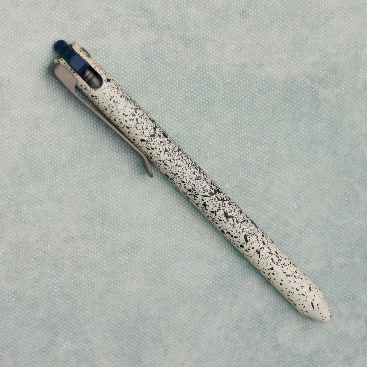 Aluminum body with white and black splatter cerakote, blue and black g10 flipper and titanium clip, unlike other pens on the market this pen comes with the ability to use your favorite refills. With this kit are 2 length adapters, 3 springs, and 3 popular refills.