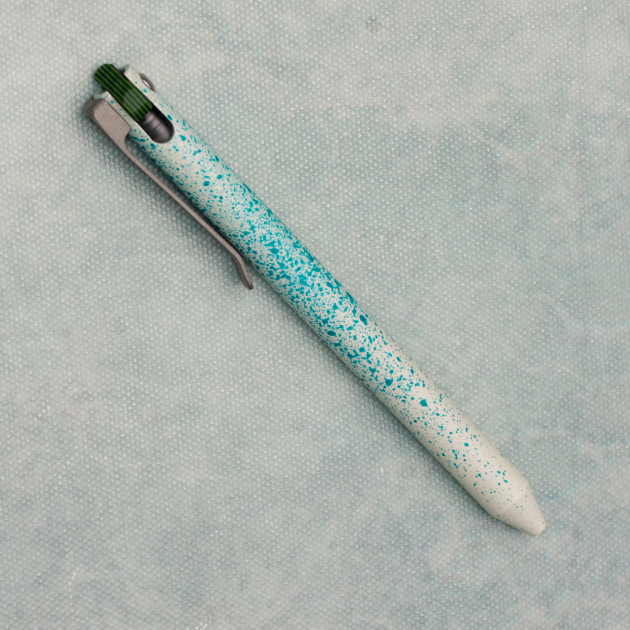Aluminum body with white and teal splatter cerakote, green and black g10 flipper and titanium clip, unlike other pens on the market this pen comes with the ability to use your favorite refills. With this kit are 2 length adapters, 3 springs, and 3 popular refills.