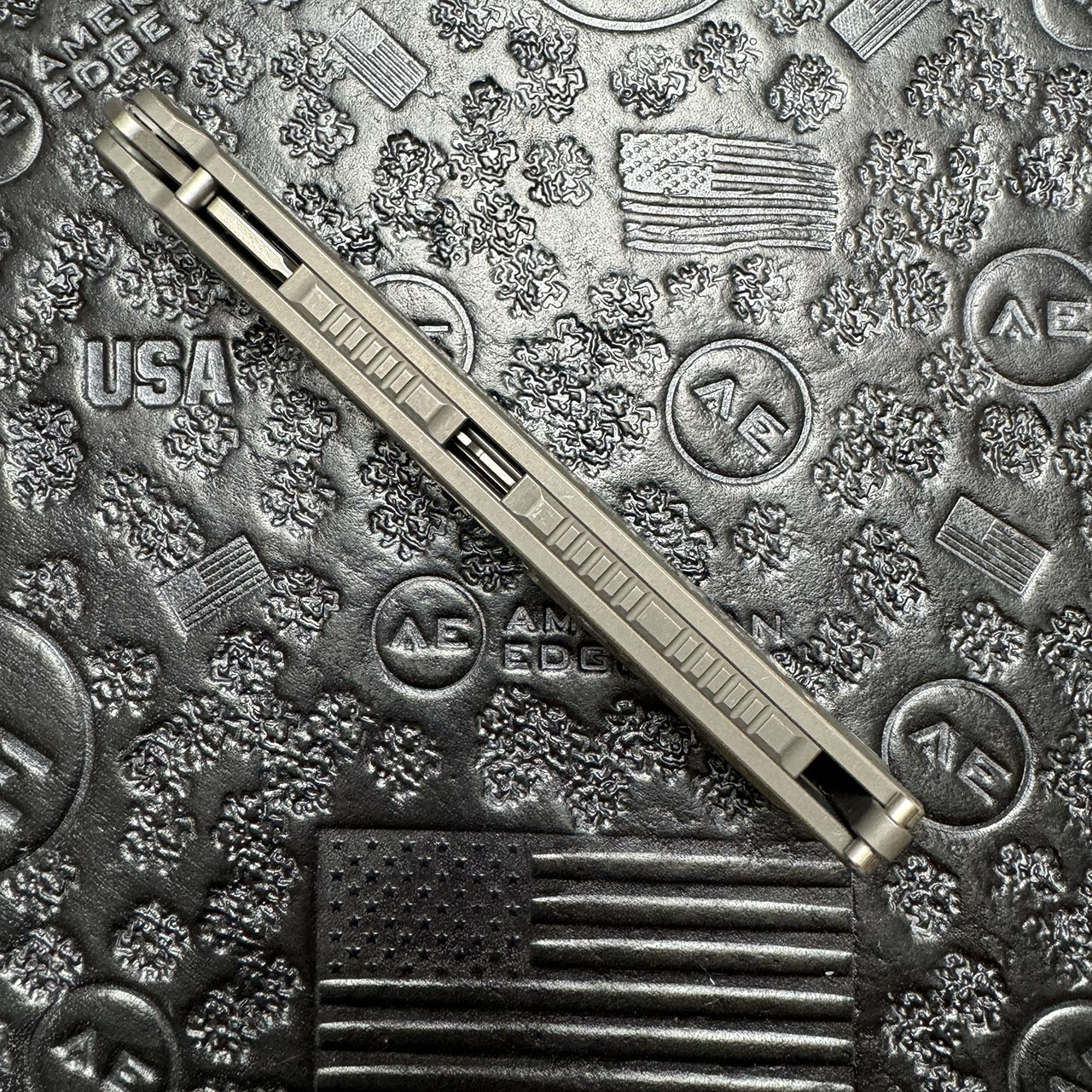 This model features darkwash titanium handles with carbon fiber inlays, titanium spacers and a satin finished M390 drop point blade. New in box.