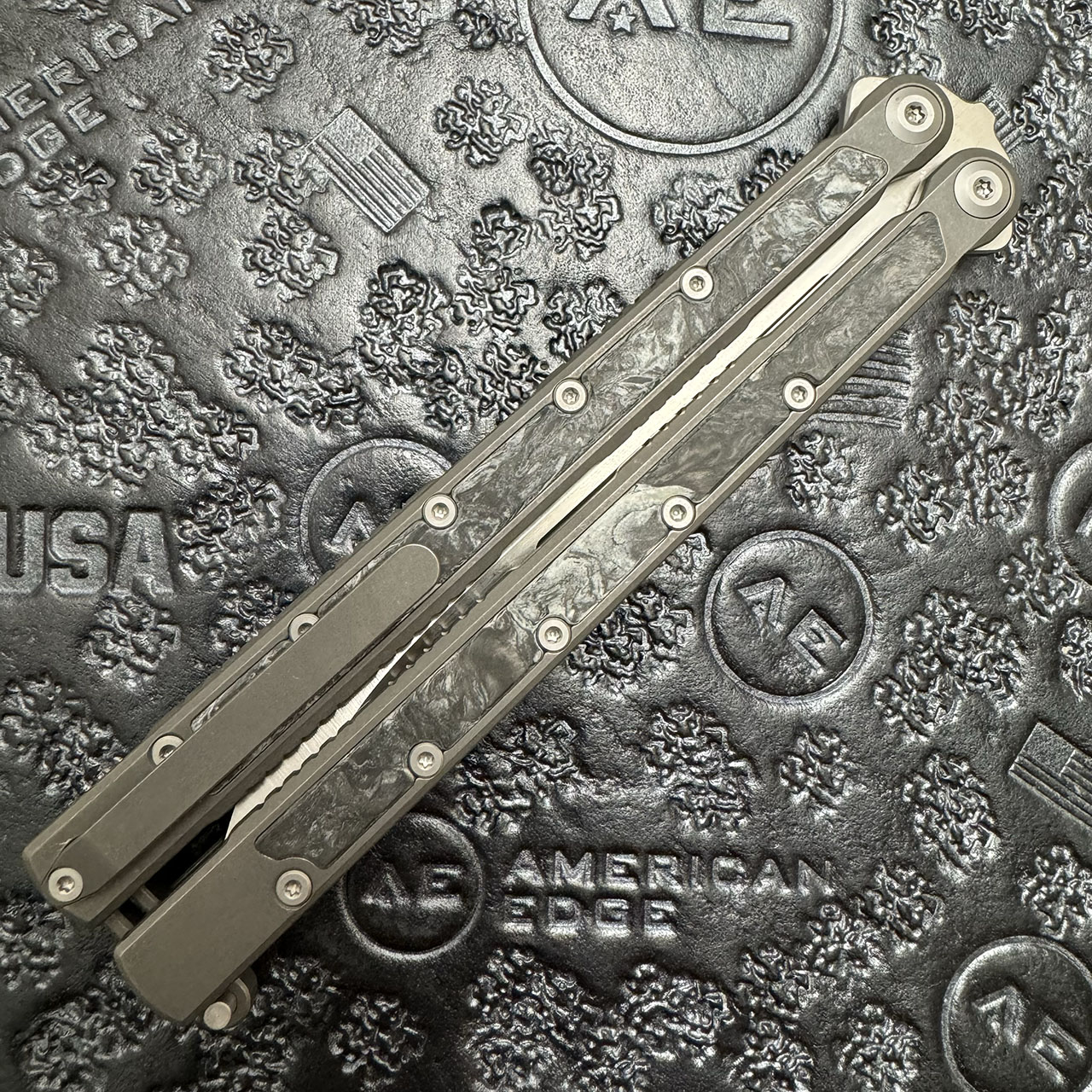 Maxace Shi Balisong Butterfly Knife Darkwash Titanium Handle w/ Carbon Fiber Inlays Satin M390 Blade MCSH202