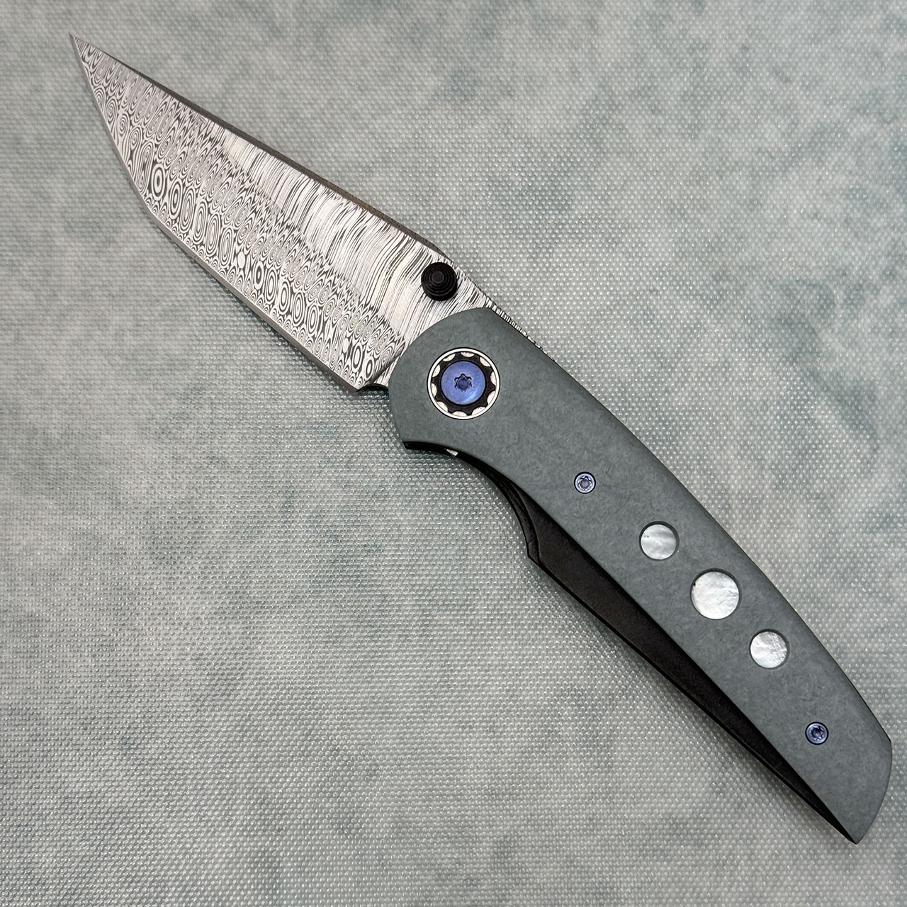 This model features gray glass handles woth mother of pearl underlays on the front. Damasteel tanto blade. Zirc clip, and backspacer. Brand new in hardcase.
