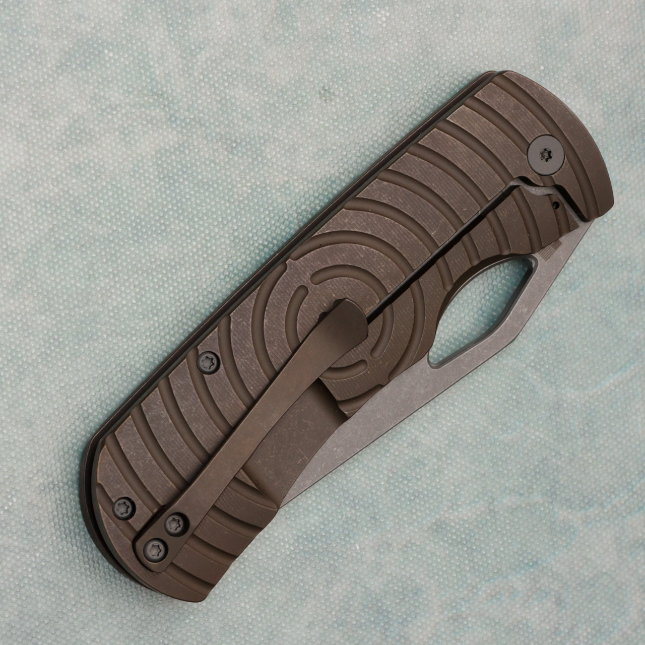 This model features bronze shockwave titanium handles. Matte stonewash finished CPM-MagnaCut stainless steel blade. Stonewash finished titanium hardware. Brand new in box.