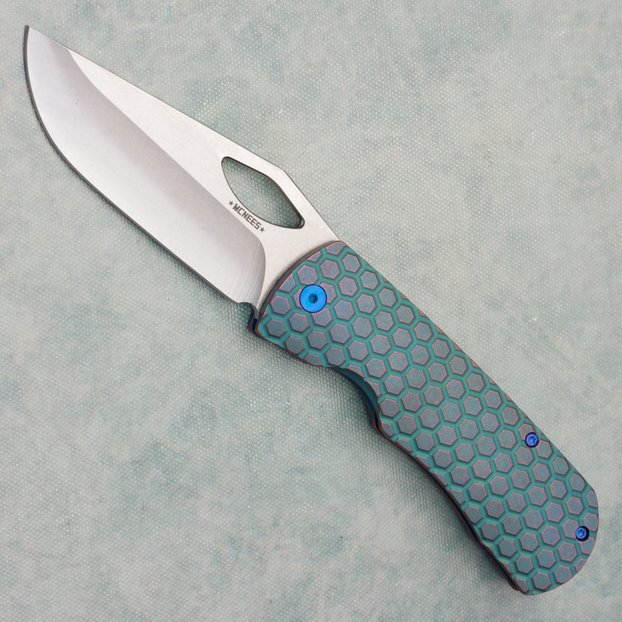 McNees Knives Dixon Frame Lock Honeycomb Light Blue/Purple Anodized Titanium Handle Satin Stonewash Magnacut Blade Blurple Satin Hardware AE CUSTOM SHOP