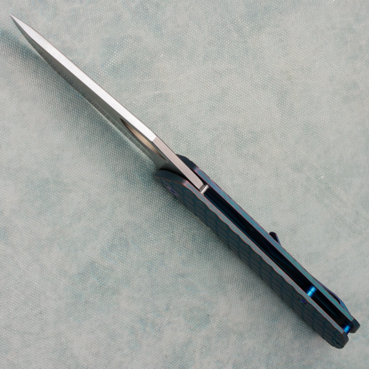 This model features stonewash honeycomb titanium handles anodized light blue with purple undertones. Satin stonewash finished CPM-MagnaCut stainless steel blade. Satin finished titanium hardware anodized blurple. Brand new in box.