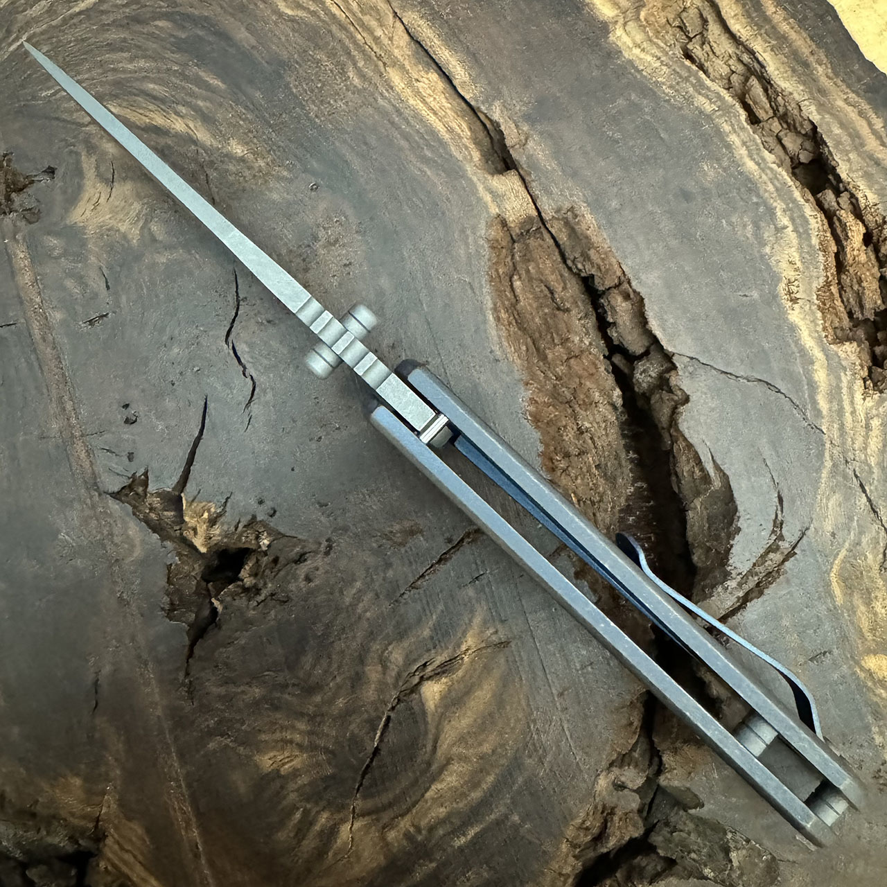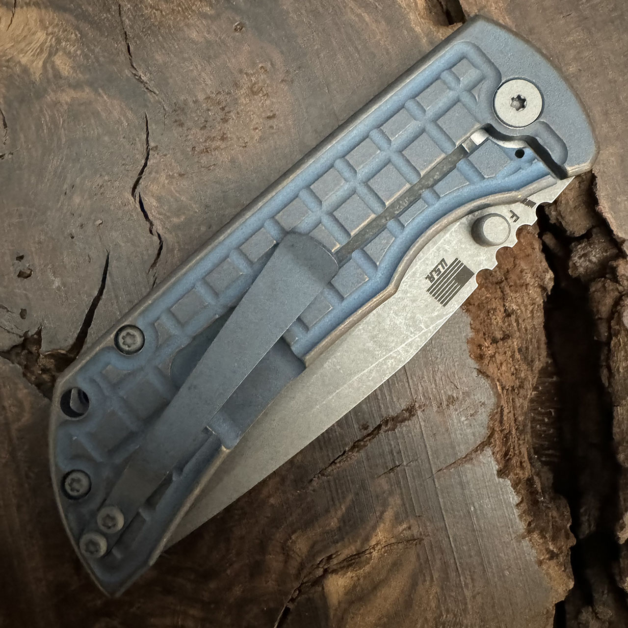 This model features a frag titanium handle with an atomic blue/bronze anodized finish. Matte stonewash finish CPM-MagnaCut stainless steel drop point blade. Bead blast finished titanium hardware. Brand new in box.