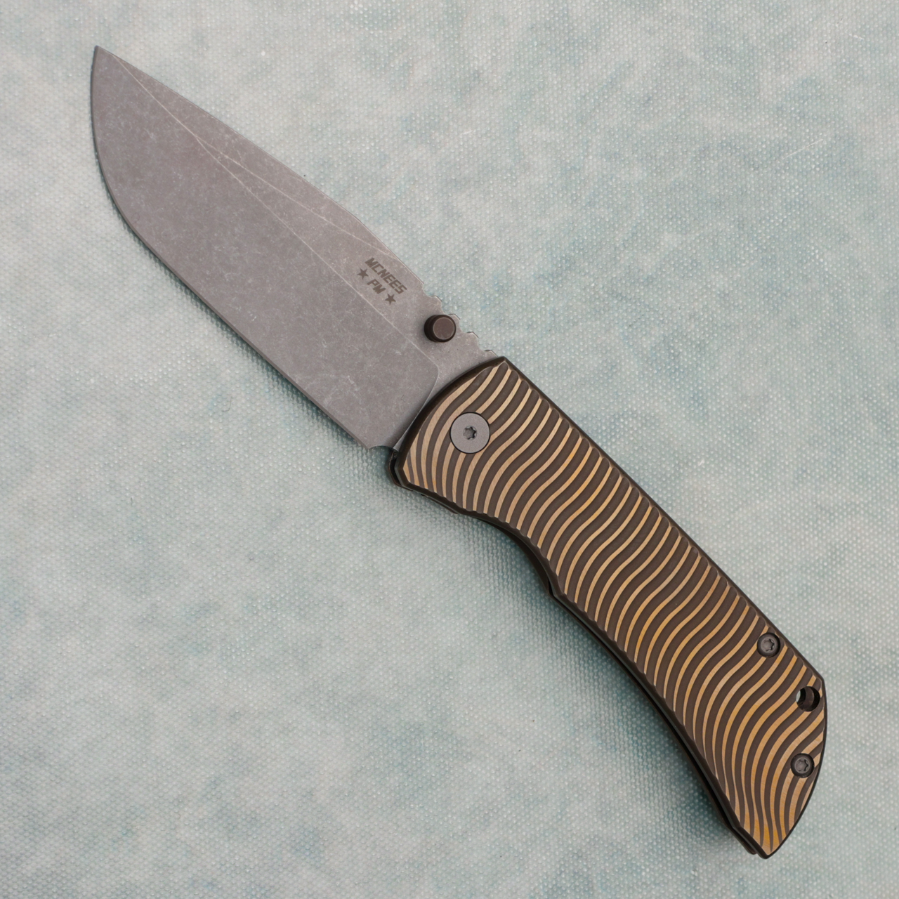 McNees Knives PM MAC 2 3.5 Gen 2 Atomic Bronze Swerve Two-Tone Titanium Handle Matte Stonewash Flat Ground Drop Point Magnacut Blade Lynch NW Clip (Consignment)