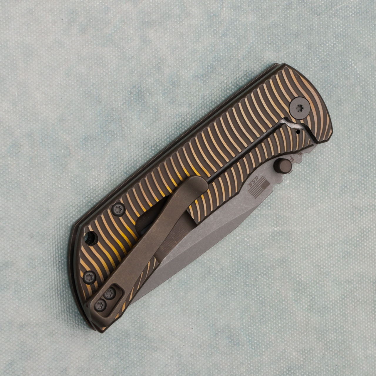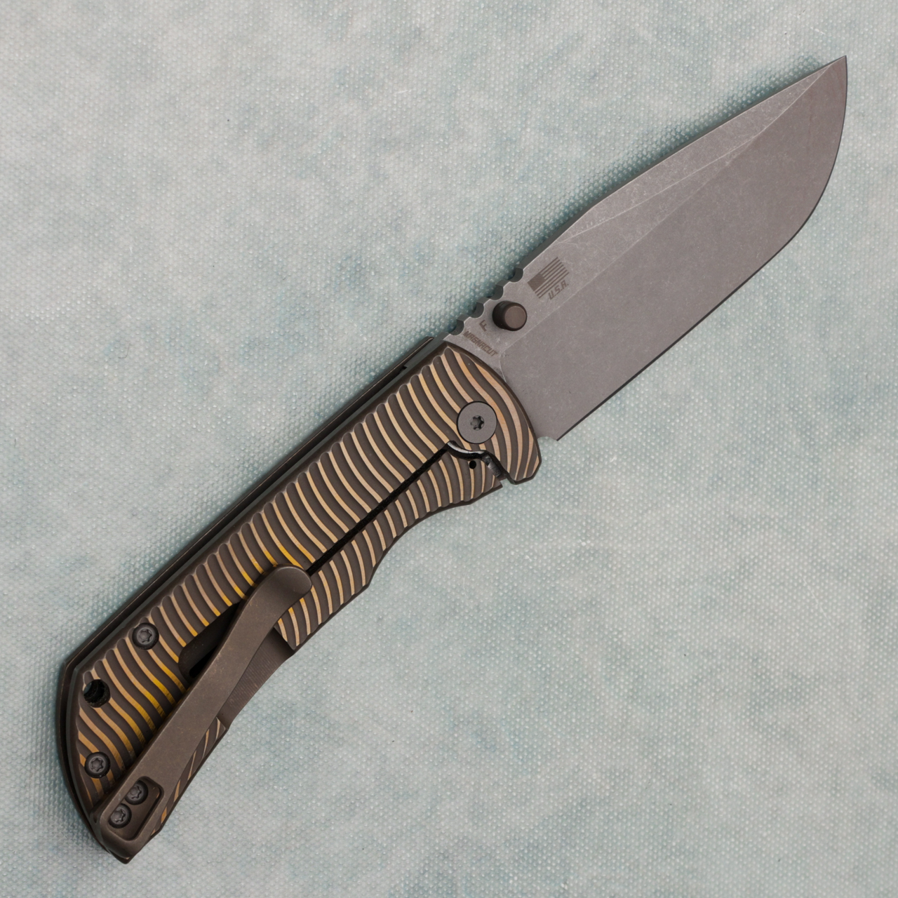 This model features bronze swerve titanium handles with an atomic anodized finish. Matte stonewash finished CPM-MagnaCut stainless steel drop point blade with a flat grind. Bead blast finished titanium hardware. Tip of blade shows some light cut marks, otherwise great shape. Factory edge, with a Lynch nw milled titanium deep carry clip on it, comes in box.