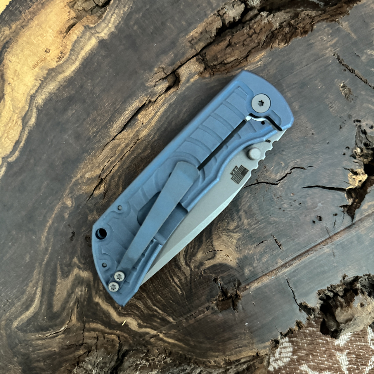 This model features a blue shockwave textured titanium handle. Matte stonewash finish CPM-MagnaCut stainless steel clip point blade. Bead blast finished stainless steel hardware. Matching anodized titanium pocket clip. Brand new in box.