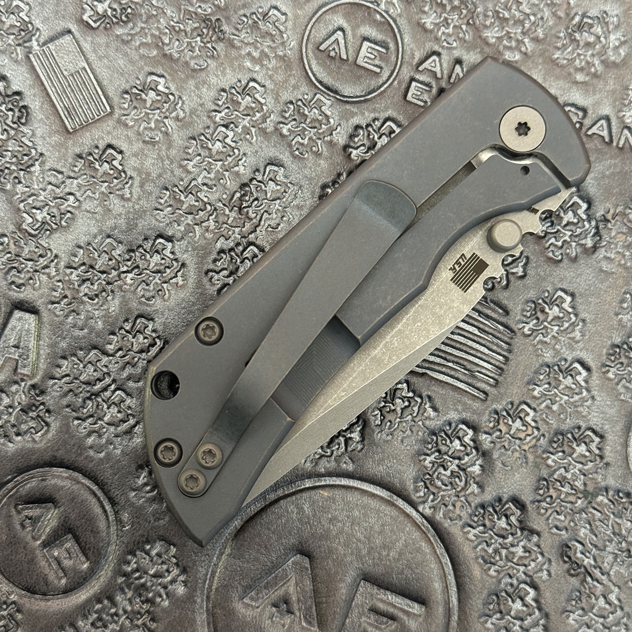 This model features a smooth titanium handle with an atomic blue bronze finish. Matte stonewash finished CPM-Magnacut stainless steel clip point blade. Stainless steel hardware. Matching anodized titanium pocket clip. Brand new in box.