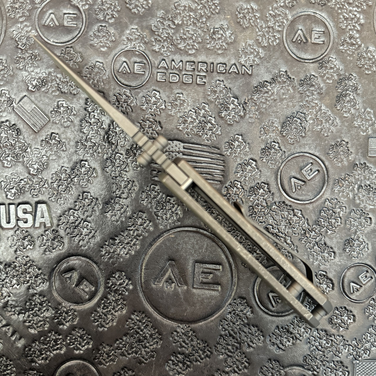 This model features a smooth titanium handle with an atomic finish. Matte stonewash finished CPM-Magnacut stainless steel clip point blade. Stainless steel hardware. Matching anodized titanium pocket clip. Brand new in box.