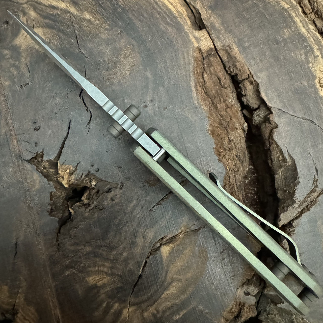 This model features a smooth titanium handle with an atomic green/bronze finish. Atomic stonewashed finished CPM-Magnacut stainless steel clip point blade. Full bronze titanium hardware. Matching anodized titanium pocket clip. Brand new in box.