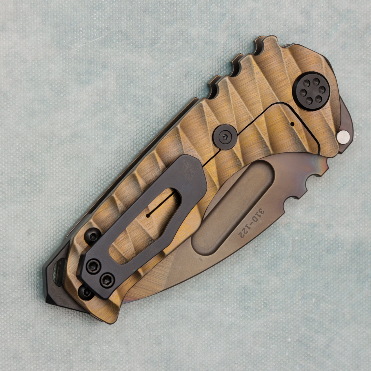 The Genesis T is a smaller model than the standard Praetorian T. This model features bronze anodized lightning sculpted titanium scales. Vulcan CPM-S45VN blade and black hardware and clip. Brand new in box.