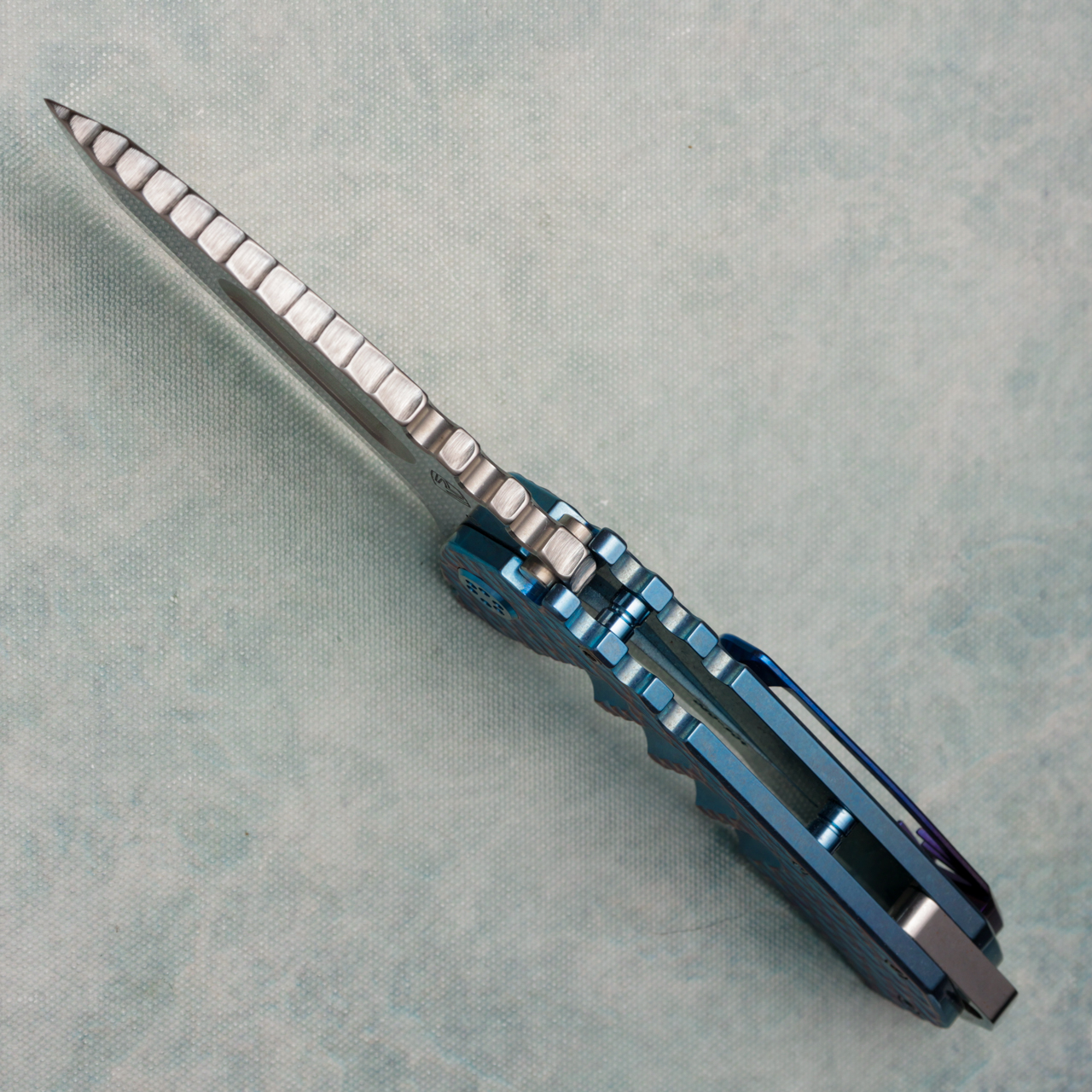 This model features teal with brushed violet anodized dragon skin titanium scales. Tumbled CPM-S35VN blade with jimmied spine and brushed teal/violet hardware and clip. Brand new in box.