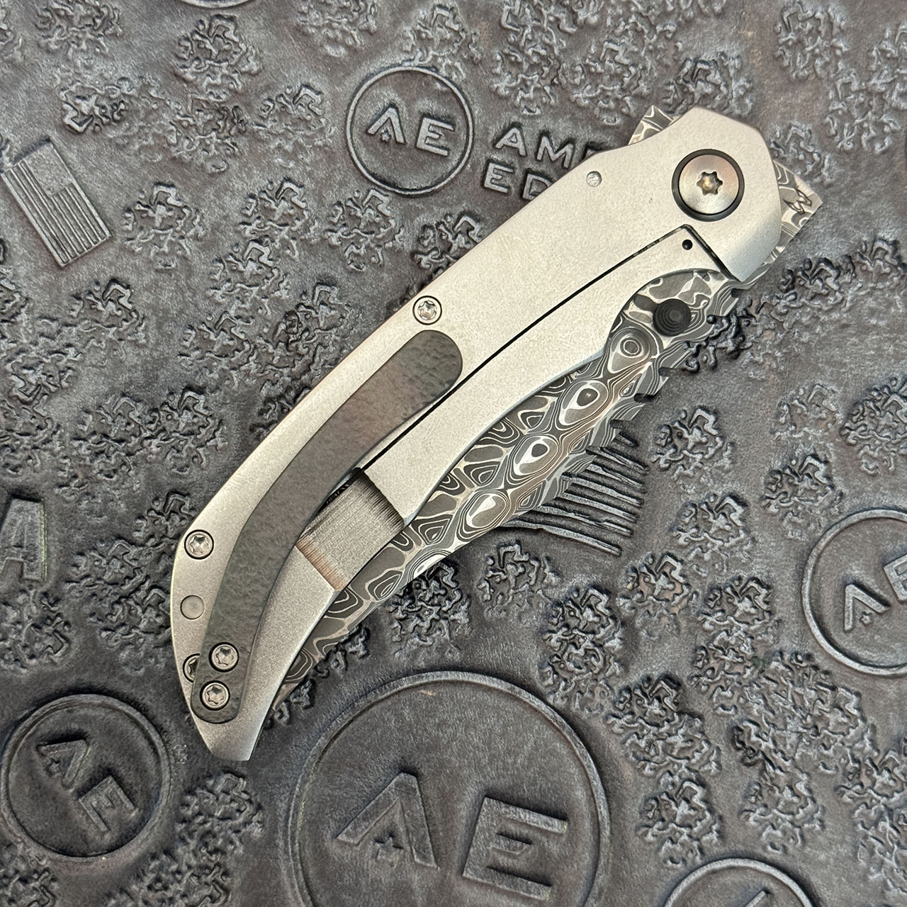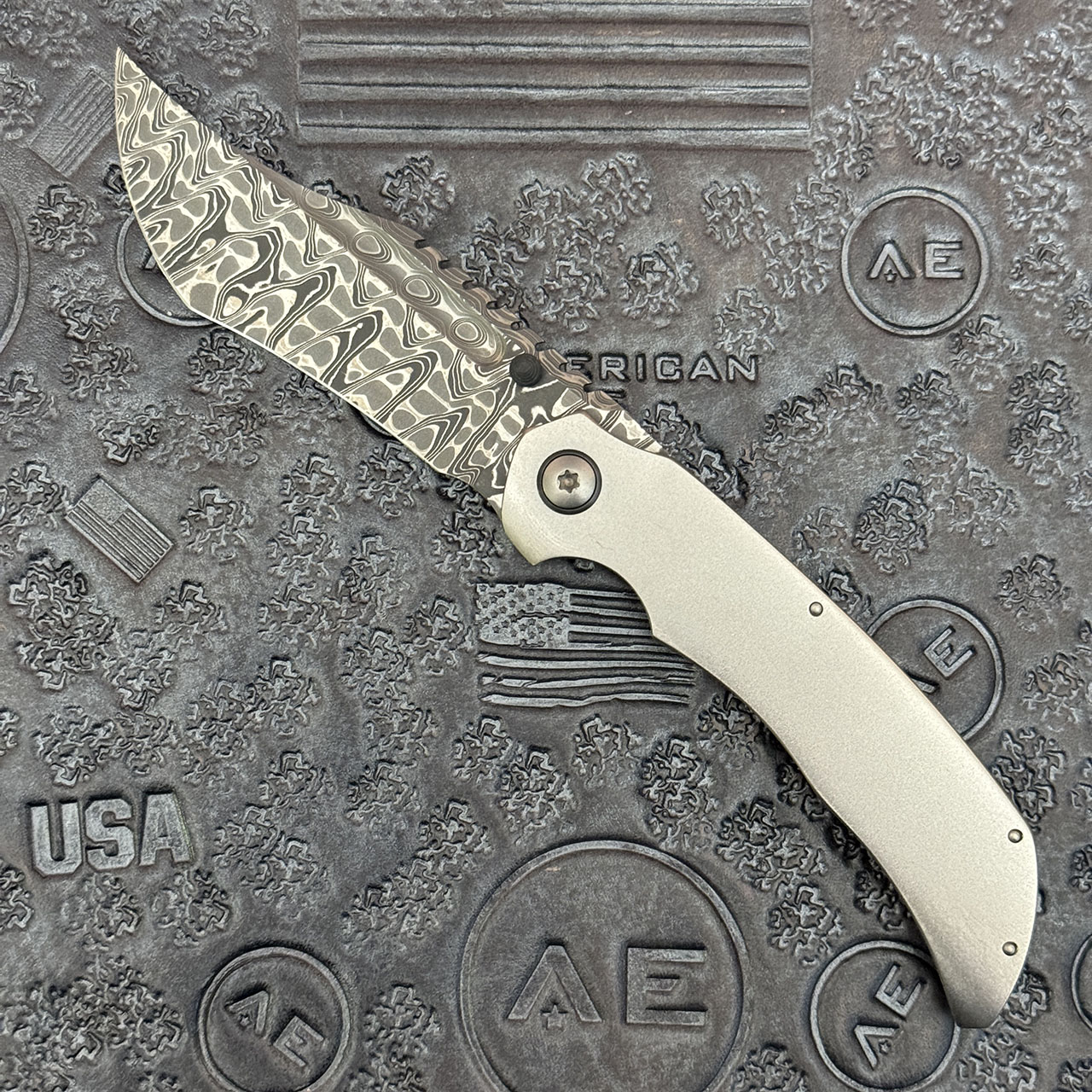 This Blade Show 2024 model features an aluminum oxide blasted titanium handle with zirc accents. Chad Nichols Intrepid Damascus blade. Runs on PB washers. Brand new in pouch with COA and patch.