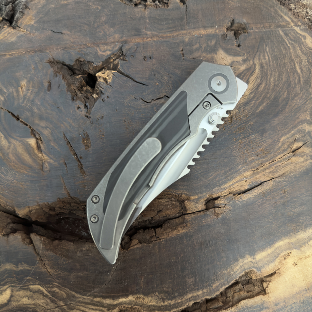This model features a dark blast stonewash titanium handle with layered carbon fiber inlay. Satin finished M390 stainles steel blade. Zirc pivot collar and backspacer. New in box.