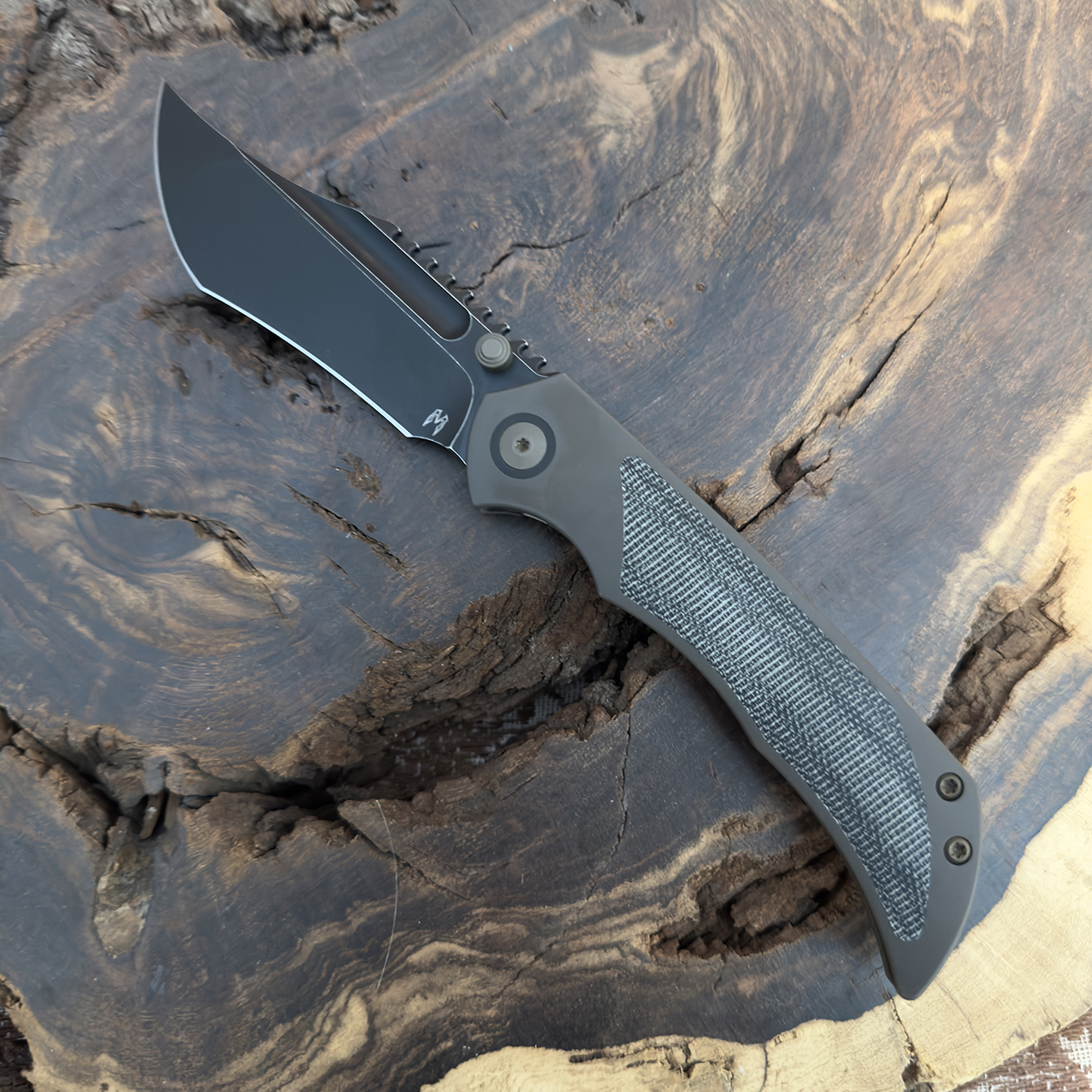 This model features a dark bronze ano titanium handle with black micarta inlay. Stonewash finished M390 stainles steel blade. Bronze hardware. Black pivot collar. New in box.