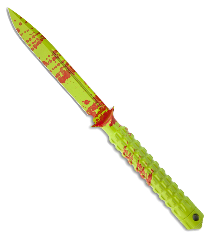The ADO is crafted from a solid billet of Zombie Green with red blood splatter coated 440A stainless steel, with a single edge blade. To top off the hollow handle Anthony Marfione integrated a removable glass break butt cap. The A.D.O. is carried in a secure kydex boot clip sheath with Zombie Green accents. The ADO's are awesome to begin with, the Zombie edition takes it over the top! Brand new in box.