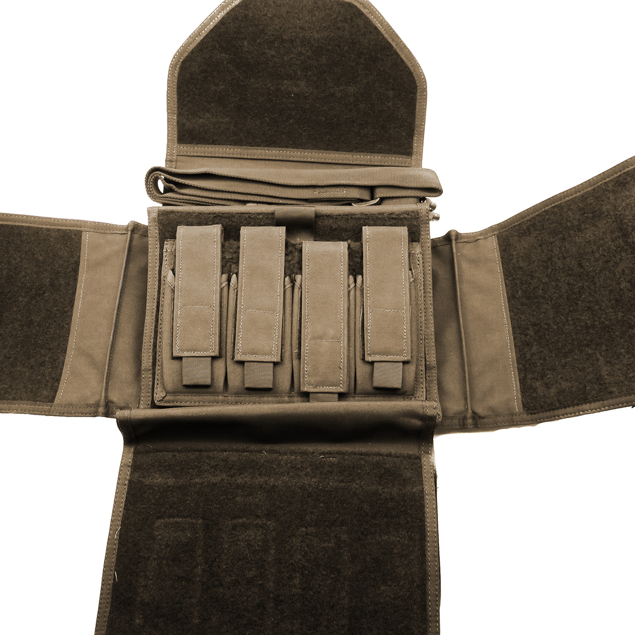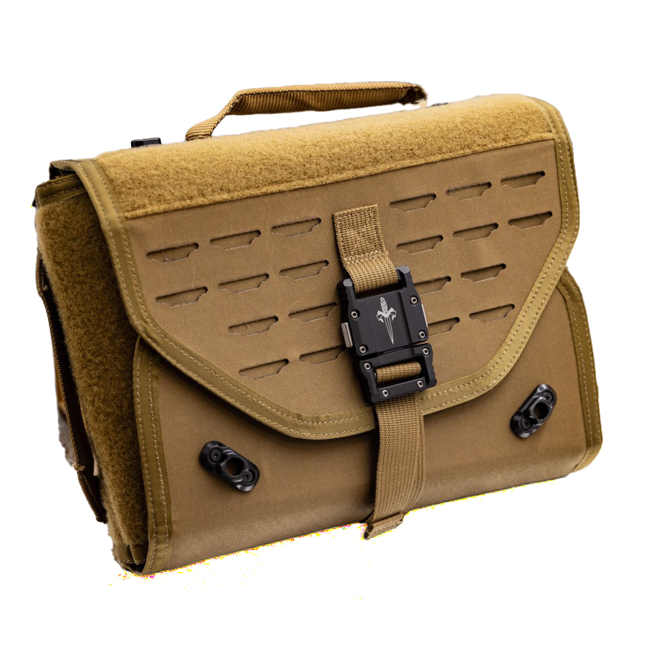 This Custom nylon Microtech AMF "Accessory Management Folder" features 12 openings for your collection. This all in one oranizing system was colloborated between Microtech and X-RingCustoms to give protection to up to 12 knives. It is made in America and features USA-sourced fabrics. Comes with a Magpul rifle sling for shoulder carry. Proprietary 775-T6 aluminum buckle with lasered Marfione dagger for secure close and Polartec lining. The BADMF is Berry Compliant. Completely modular and MOLLE compatible. This particular version is coyote and measure 8" by 13" and stands approx. 8" tall