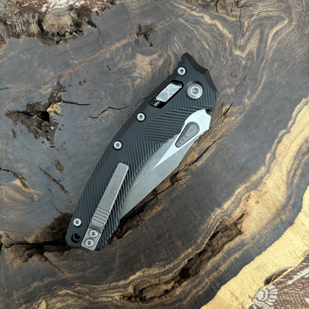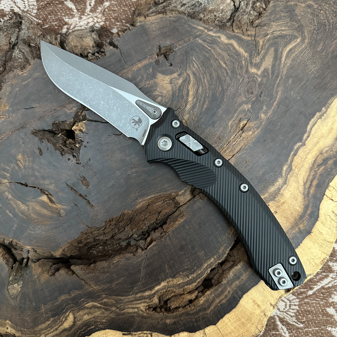 This model features fluted black aluminum handle scales. Apocalyptic finished M390MK stainless steel clip point blade. Apocalyptic finished hardware. Pocket clip features the Microtech logo, model information, serial number, and production date. Blade features the steel information and Microtech Claw logo.Brand new in box.