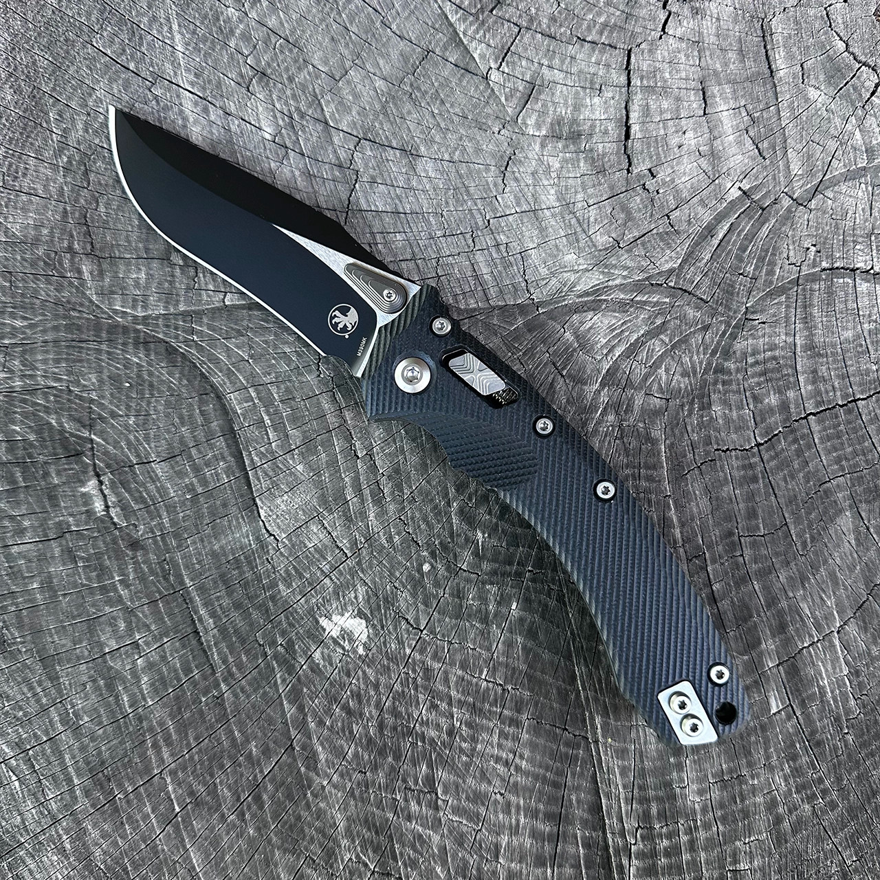 This model features fluted black G10 handle scales. Black finished M390MK stainless steel clip point blade. Pocket clip features the Microtechlogo, model information, and production date. Brand new in box.