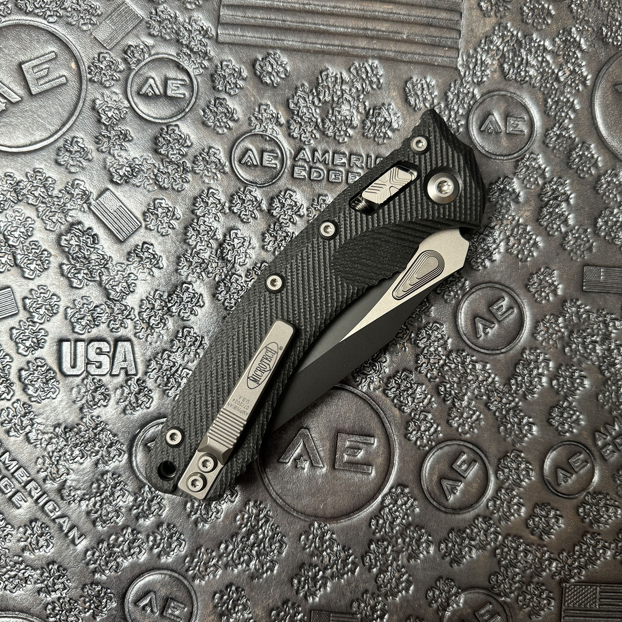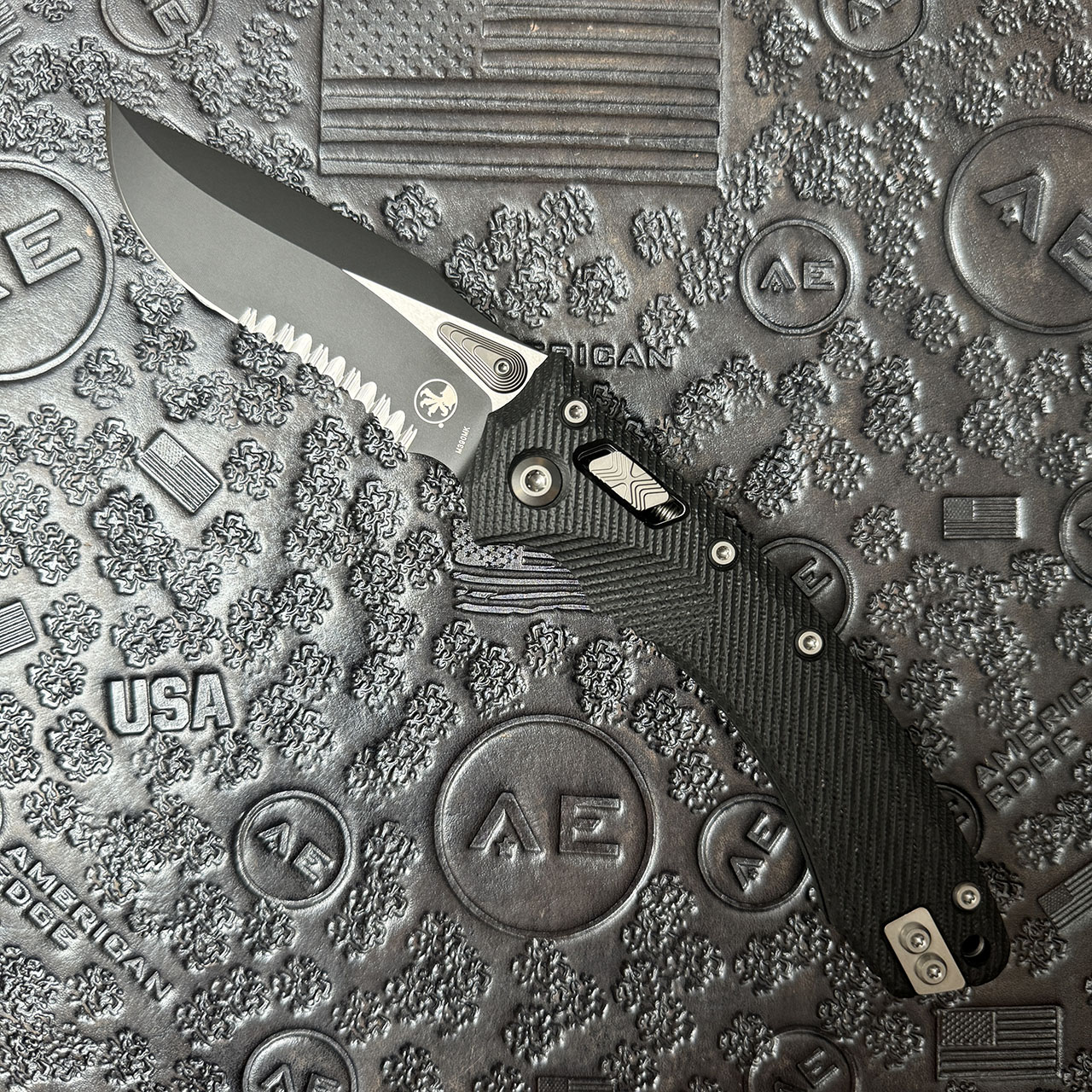 This model features fluted Black G10 handle scales. Black finished M390MK stainless steel clip point blade with partial serrations. Brand new in box.