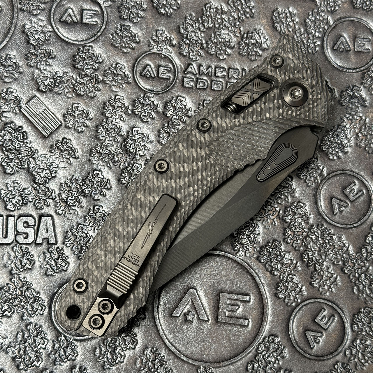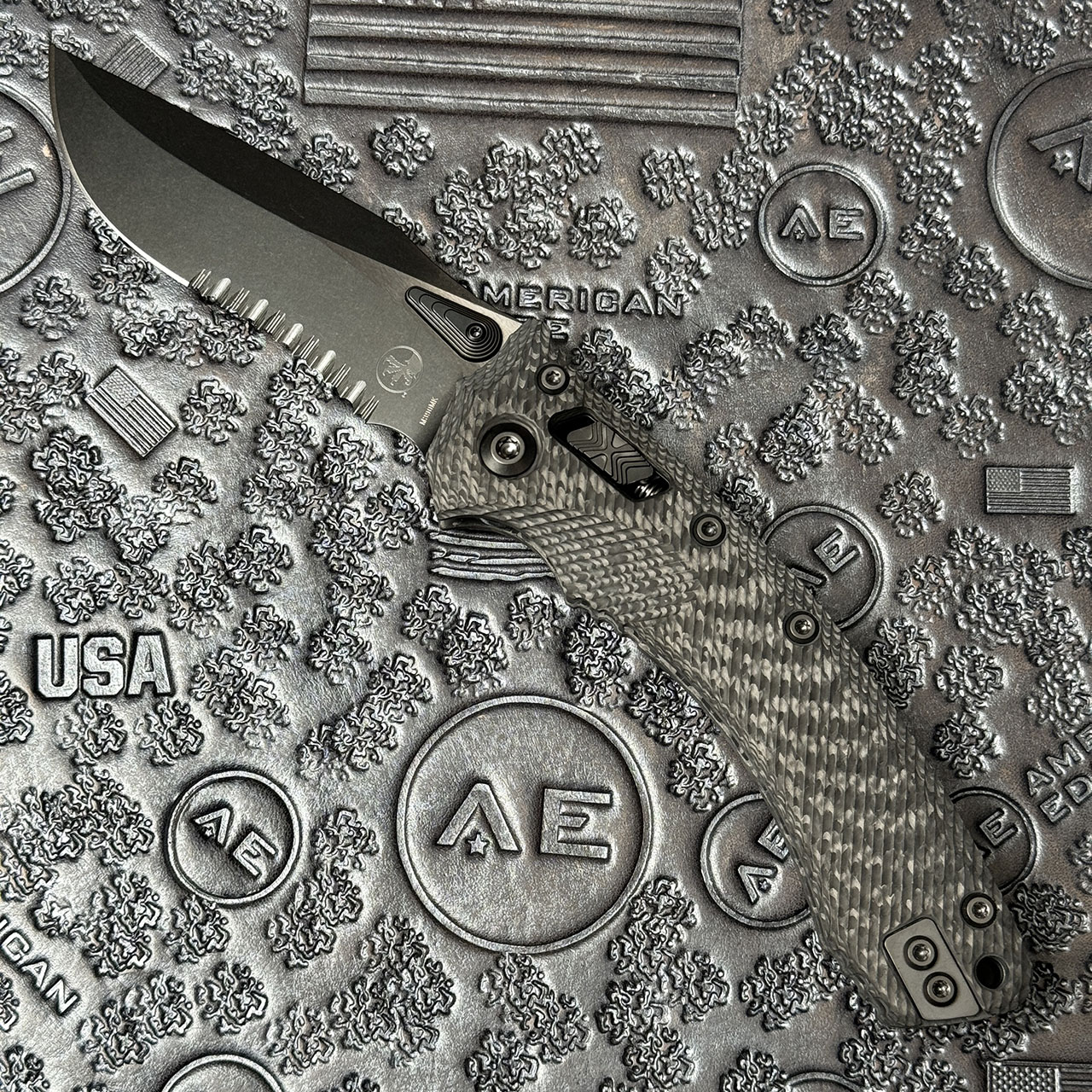 This Signature Seris model features fluted carbon fiber handle scales. DLC finished M390MK stainless steel clip point partially serrated blade. DLC finished hardware. Pocket clip features the Signature Series logo, model information, and production date. Blade is sterile. Brand new in box.