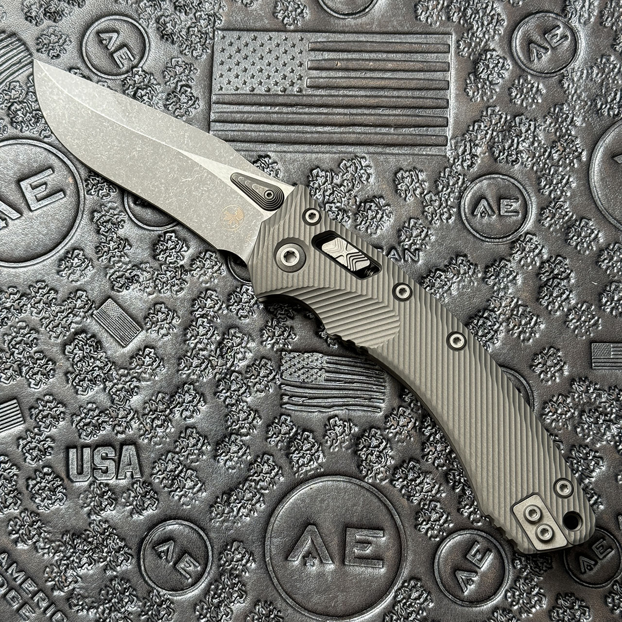 This Signature Series model features fluted natural clear aluminum handle scales. Apocalyptic finished M390MK stainless steel clip point blade. Apocalyptic finished hardware. Pocket clip features model information, serial number, and production date. Brand new in box.
