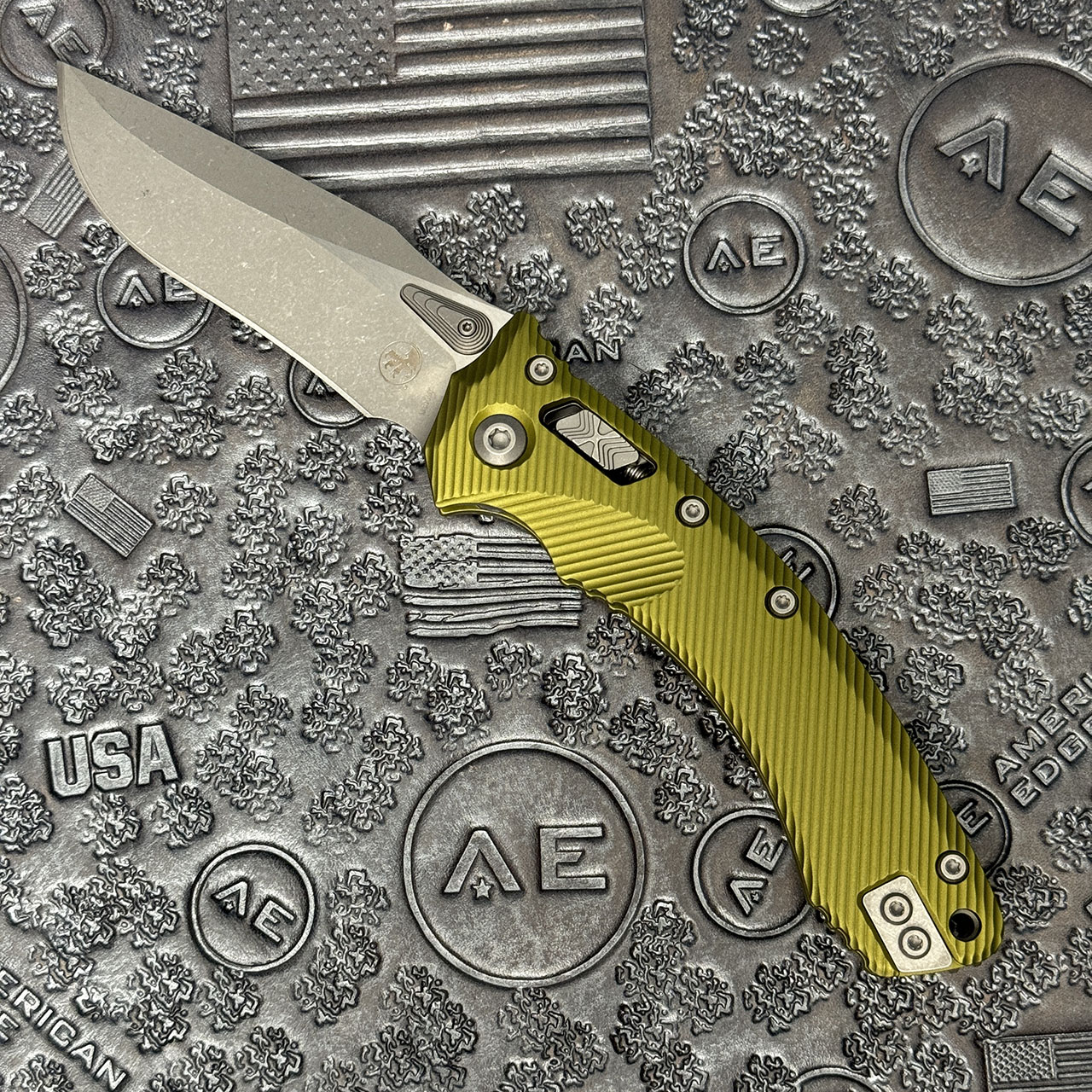 This Signature Series model features fluted OD Green aluminum handle scales. Apocalyptic finished M390MK stainless steel clip point blade. Apocalyptic finished hardware. Pocket clip features model information, serial number, and production date. Brand new in box.