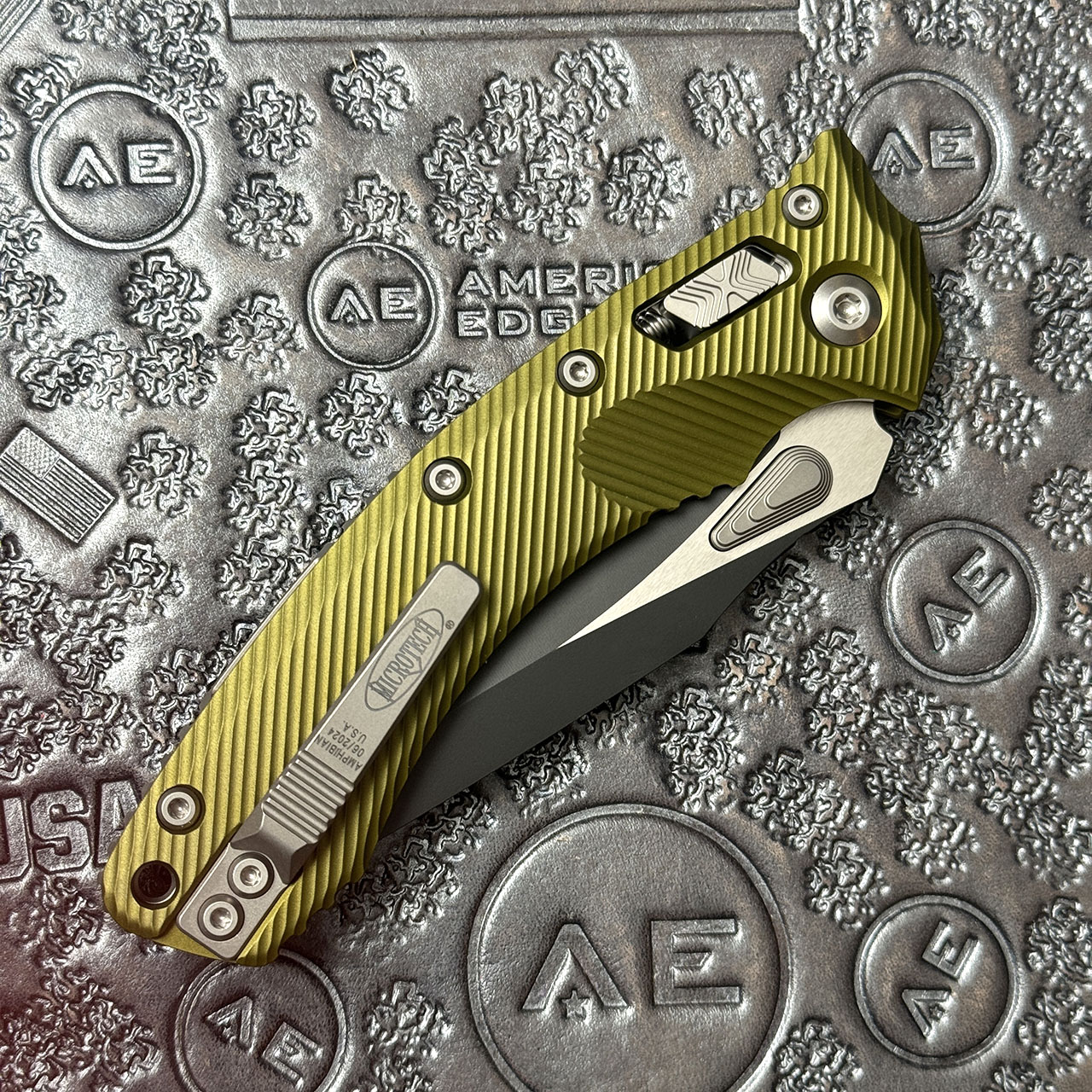 This model features fluted OD Green aluminum handle scales. Black finished M390MK stainless steel clip point blade with a partially serrated cutting edge. Bead Blast finished hardware. Pocket clip features the Microtech logo, model information, serial number, and production date. Blade feature the steel information and Microtech Claw logo. Brand new in box.