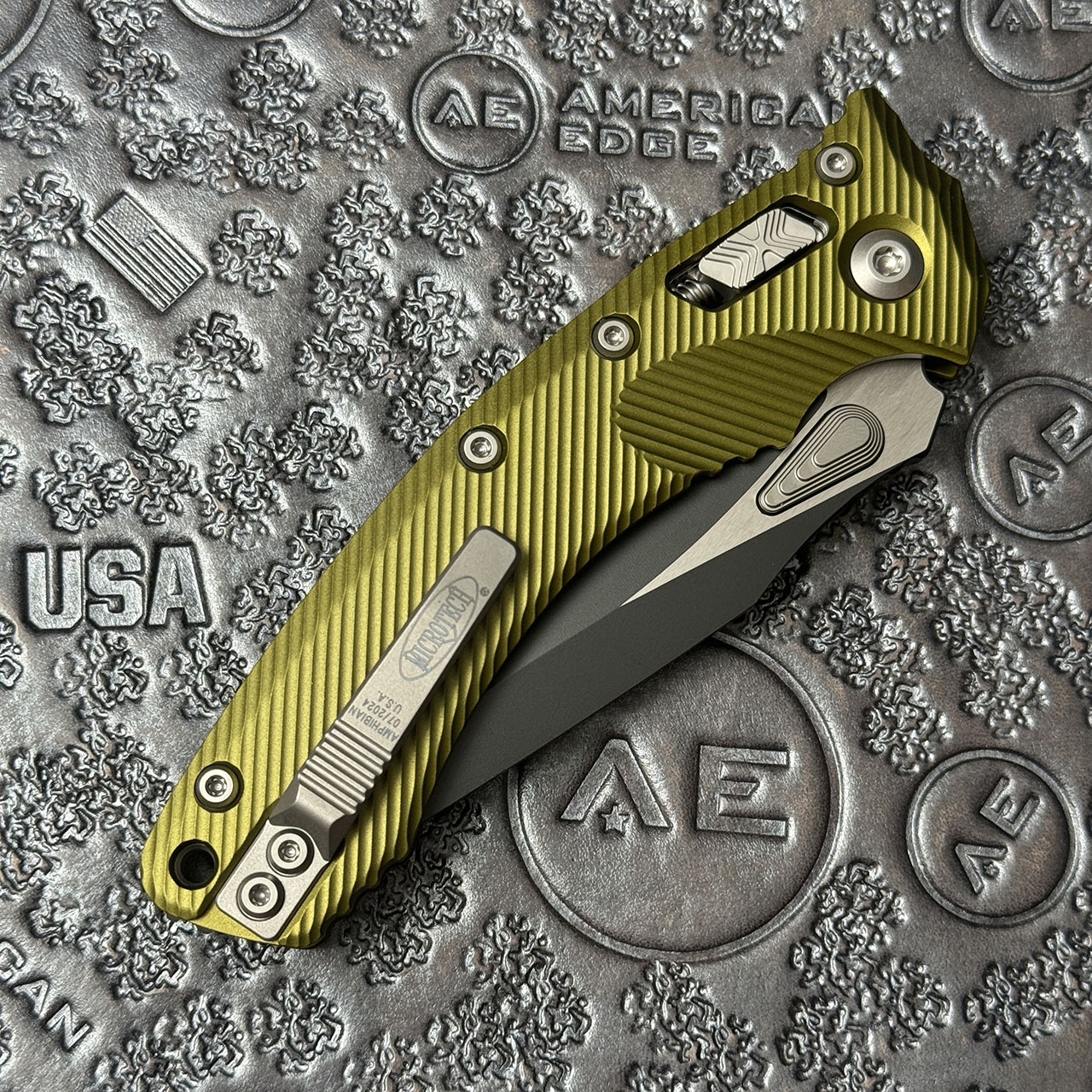 This model features fluted OD Green aluminum handle scales. Black finished M390MK stainless steel clip point blade with a standard cutting edge. Pocket clip features the Microtech logo, model information, serial number, and production date. Blade feature the steel information and Microtech Claw logo. Brand new in box.