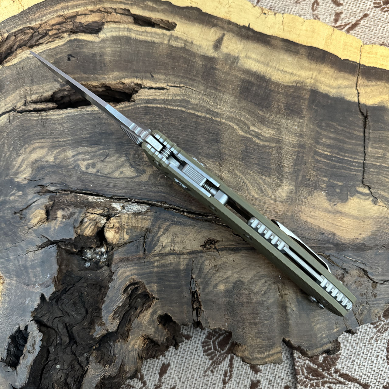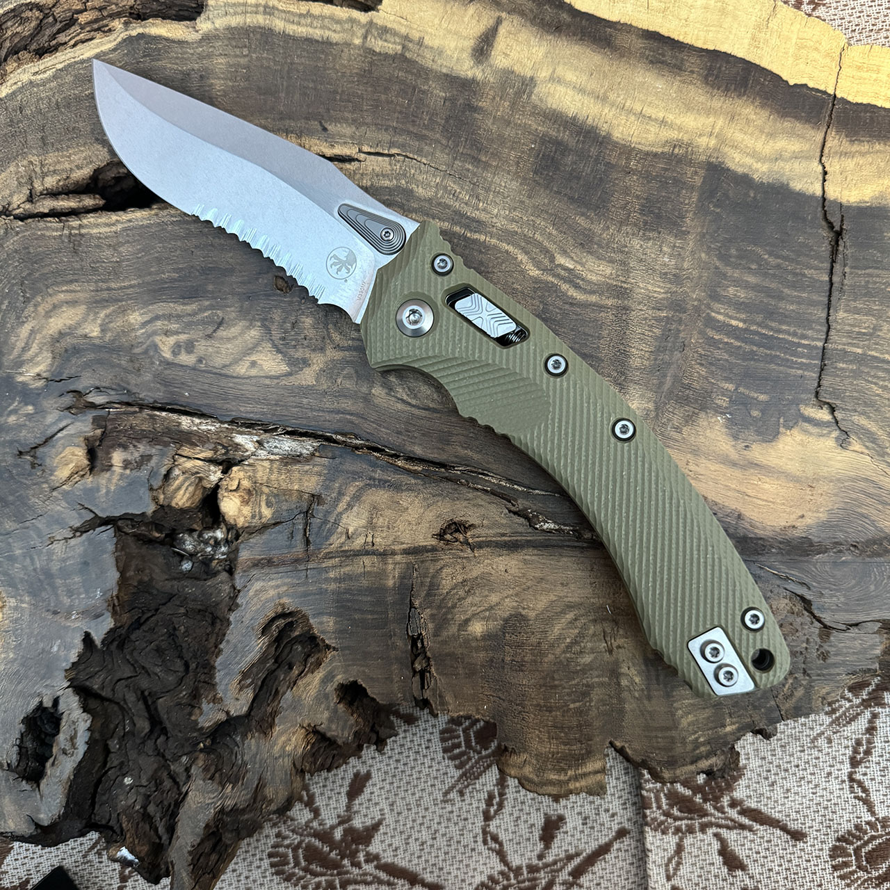 This model features fluted OD Green G-10 handle scales. Stonewash finished M390MK stainless steel clip point blade with a partially serrated cutting edge. Bead blast finished hardware. Pocket clip features the Microtech logo, model information, serial number, and production date. Blade feature the steel information and Microtech Claw logo. Brand new in box.