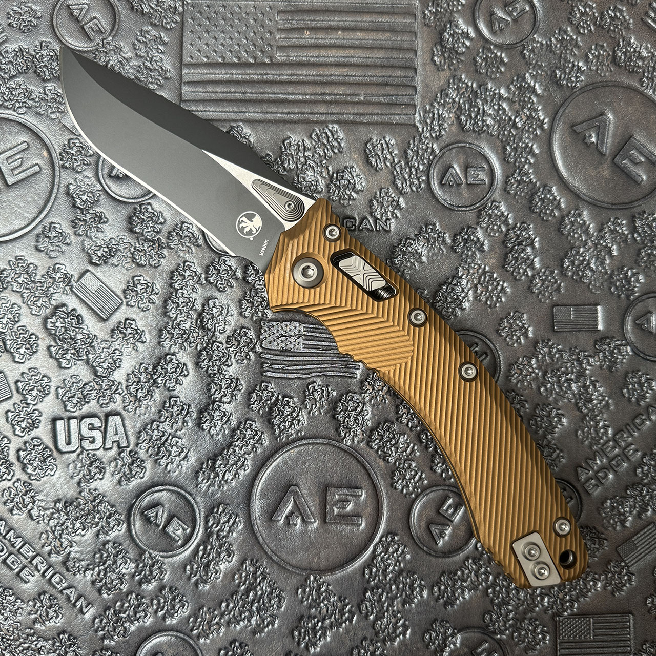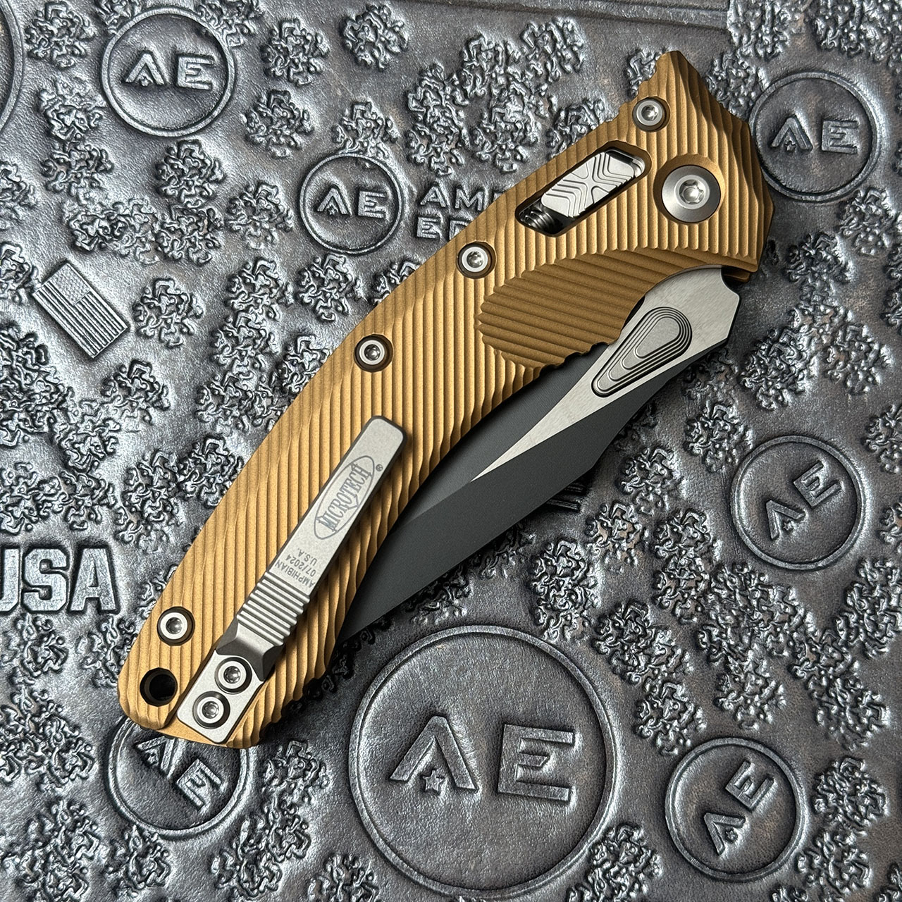 This model features fluted Tan aluminum handle scales. Black finished M390MK stainless steel clip point blade with a standard cutting edge. Pocket clip features the Microtech logo, model information, serial number, and production date. Blade feature the steel information and Microtech Claw logo. Brand new in box.