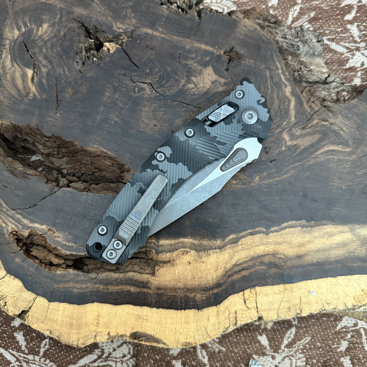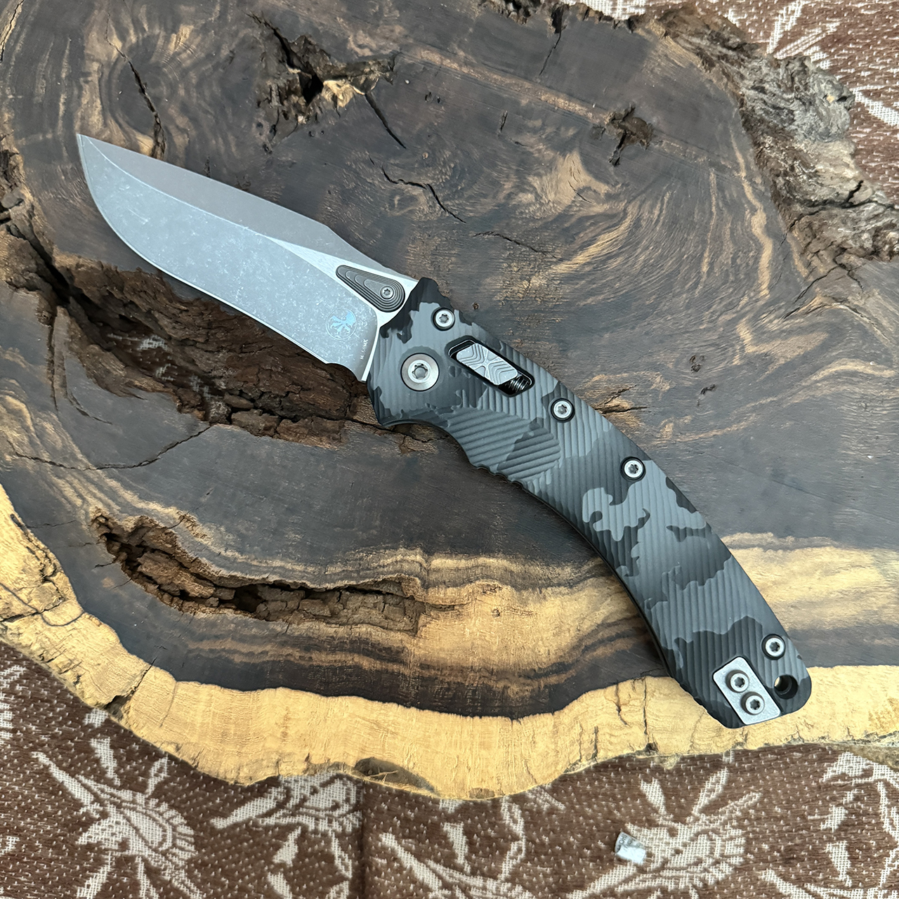 This Signature Series model features fluted urban camo aluminum handle scales. Apocalyptic finished M390MK stainless steel clip point blade. Apocalyptic finished hardware. Pocket clip features the Signature Series logo, model information, serial number, and production date. Blade features the steel information and Microtech Claw logo.Brand new in box.