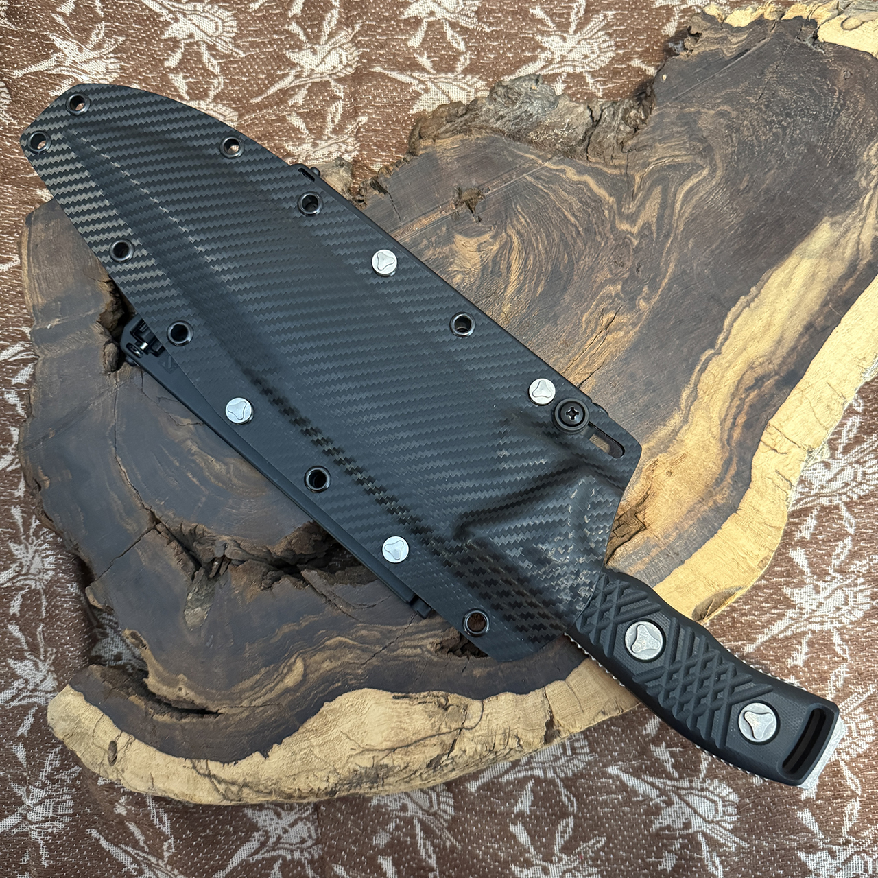 This model features black G-10 handle scales. Apoclayptic finished M390 stainless steel clip point recurve blade with a notched thumbrest and serrated cutting edge. Apocalyptic finished hardware and pocket clip. Full tang construction from thick stock. The blade is marked with the Microtech logo, model information, production date, and serial number. Includes a Molle compatible Kydex sheath. Brand new in box.