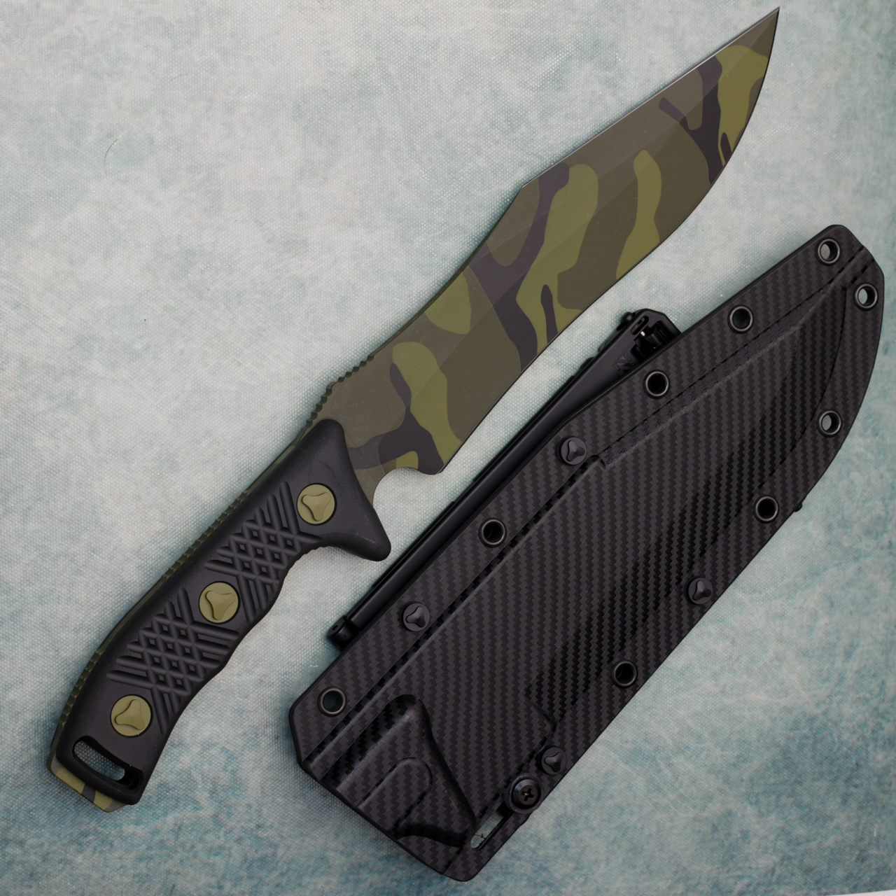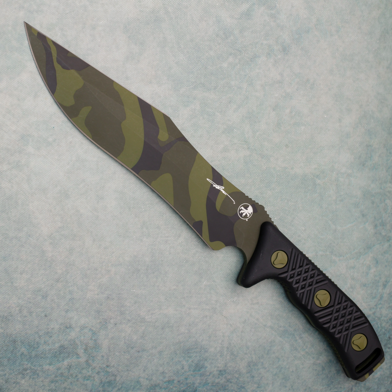 This model features black g10 handle scales. Jungle camo cerakote finished M390 stainless steel clip point recurve blade with a notched thumbrest and standard cutting edge. Cerakote finished hardware. Full tang construction from thick stock. The blade is marked with the Microtech logo, and Signature Series logo. Includes a Molle compatible sheath. Brand new in box.