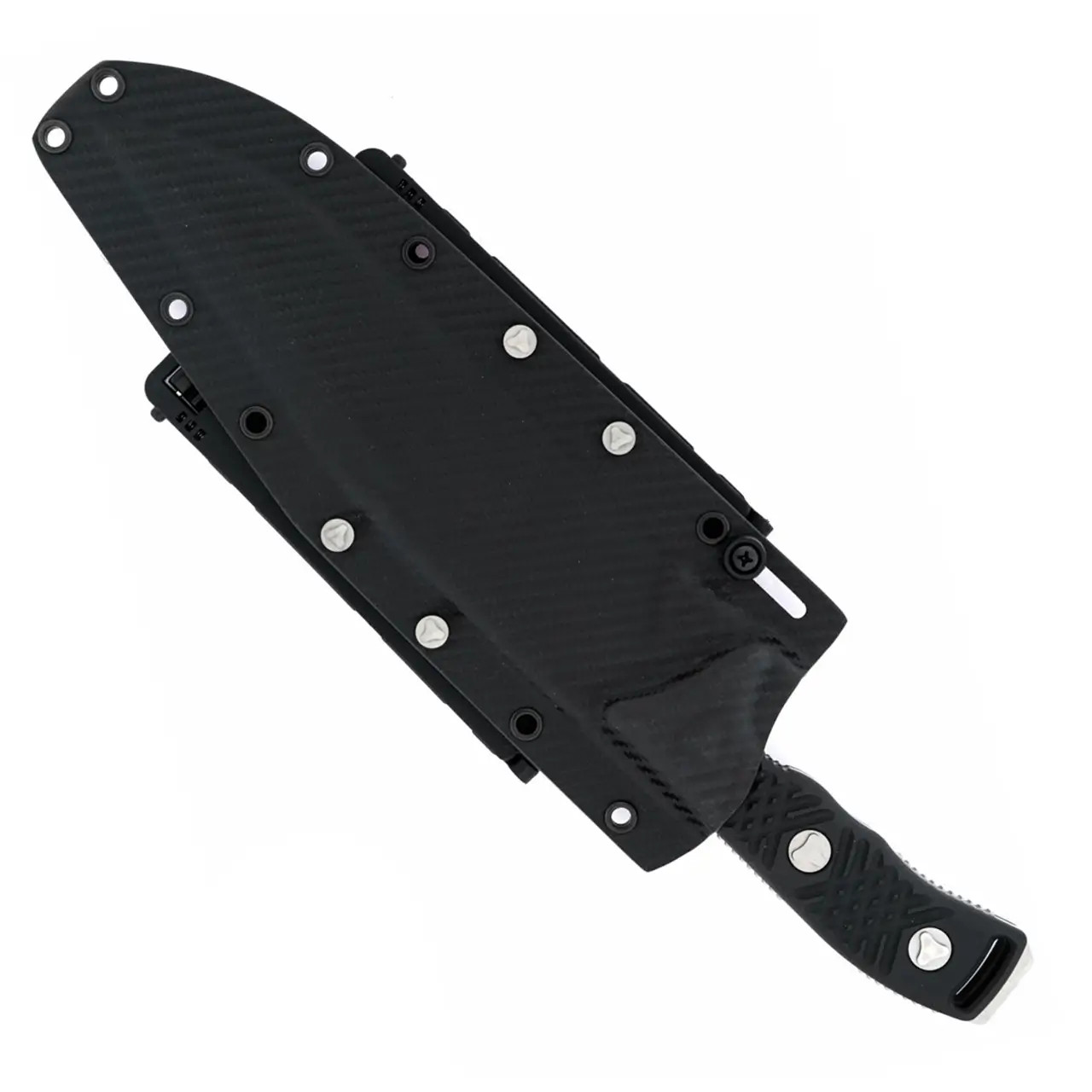 This model features black G-10 handle scales. Stonewash finished M390 stainless steel clip point recurve blade with a notched thumbrest and fully serrated cutting edges. Bead blasted finished hardware and pocket clip. Full tang construction from thick stock. The blade is marked with the Microtech logo, model information, production date, and serial number. Includes a Molle compatible Kydex sheath. Brand new in box.