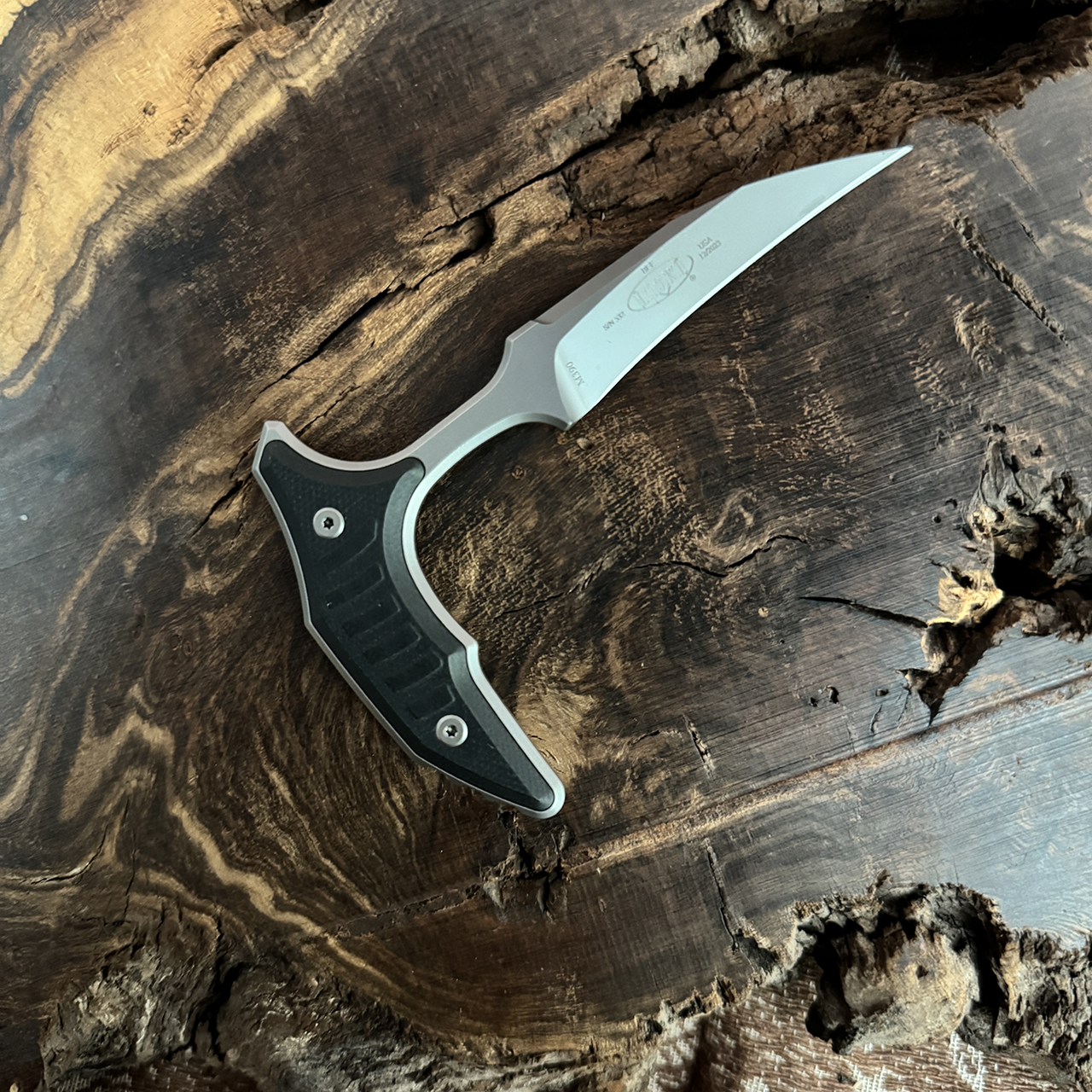 This Signature Series Bee features black G-10 handles and a bead blase M390 stainless steel wharncliffe blade with a standard cutting edge. The blade itself features the Signature Series logo and production date. The back of the Blade features the Bastinelli logo. Brand new in box.