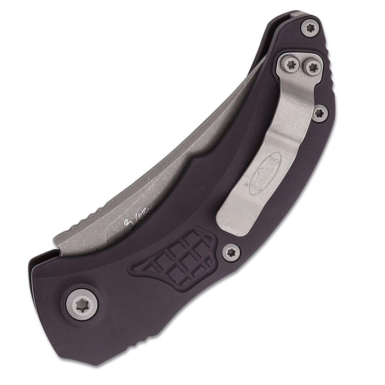 This model features a frag grip milled texture black anodized aluminum handle. Apocalyptic finished M390 stainless steel trailing point blade with serrated cutting edge. Bead blast finished hardware and pocket clip. The pocket clip is marked with the Microtech logo. The blade is marked with the Microtech logo, model information, production date, and serial number. Brand new in box.