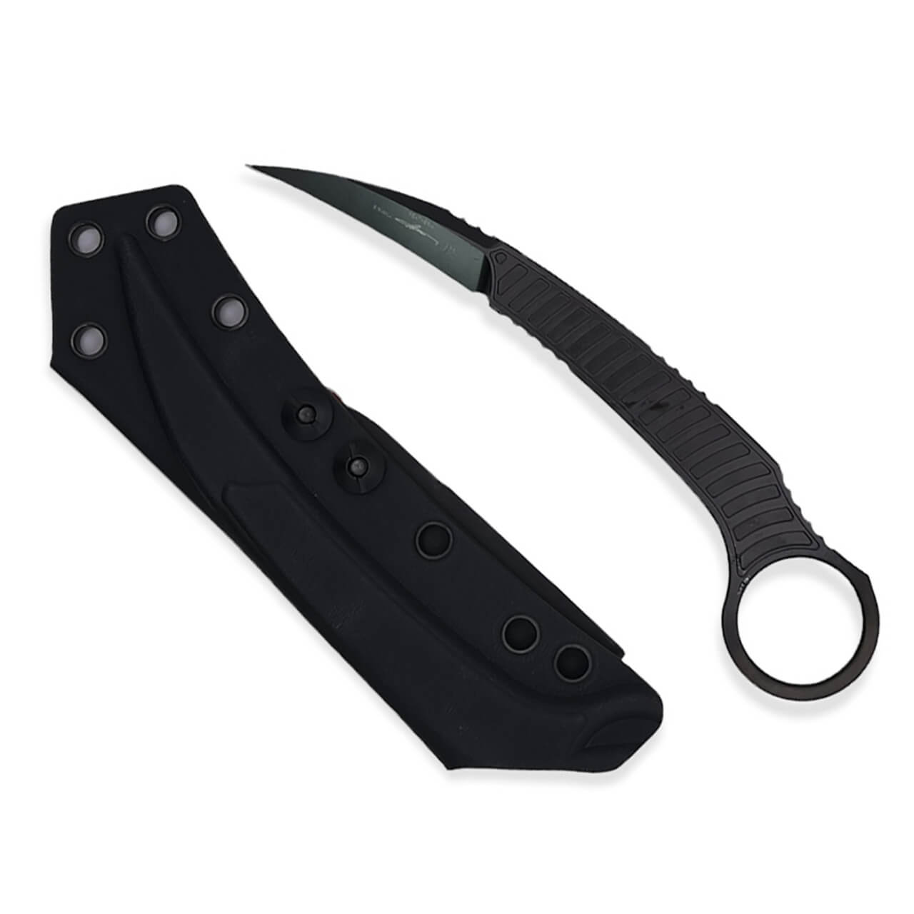 A new interpretation of a Karambit knife, the Bastinelli Feather™ features a double-ringed design and chisled DLC finished blade offering stability for a variety of maneuvers. This light and versatile knife comes with a thin, black, kydex sheath that offers full concealment.