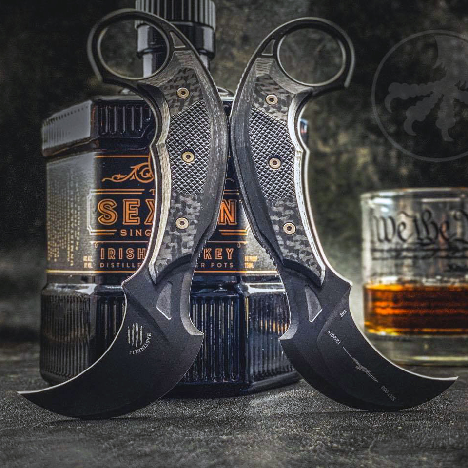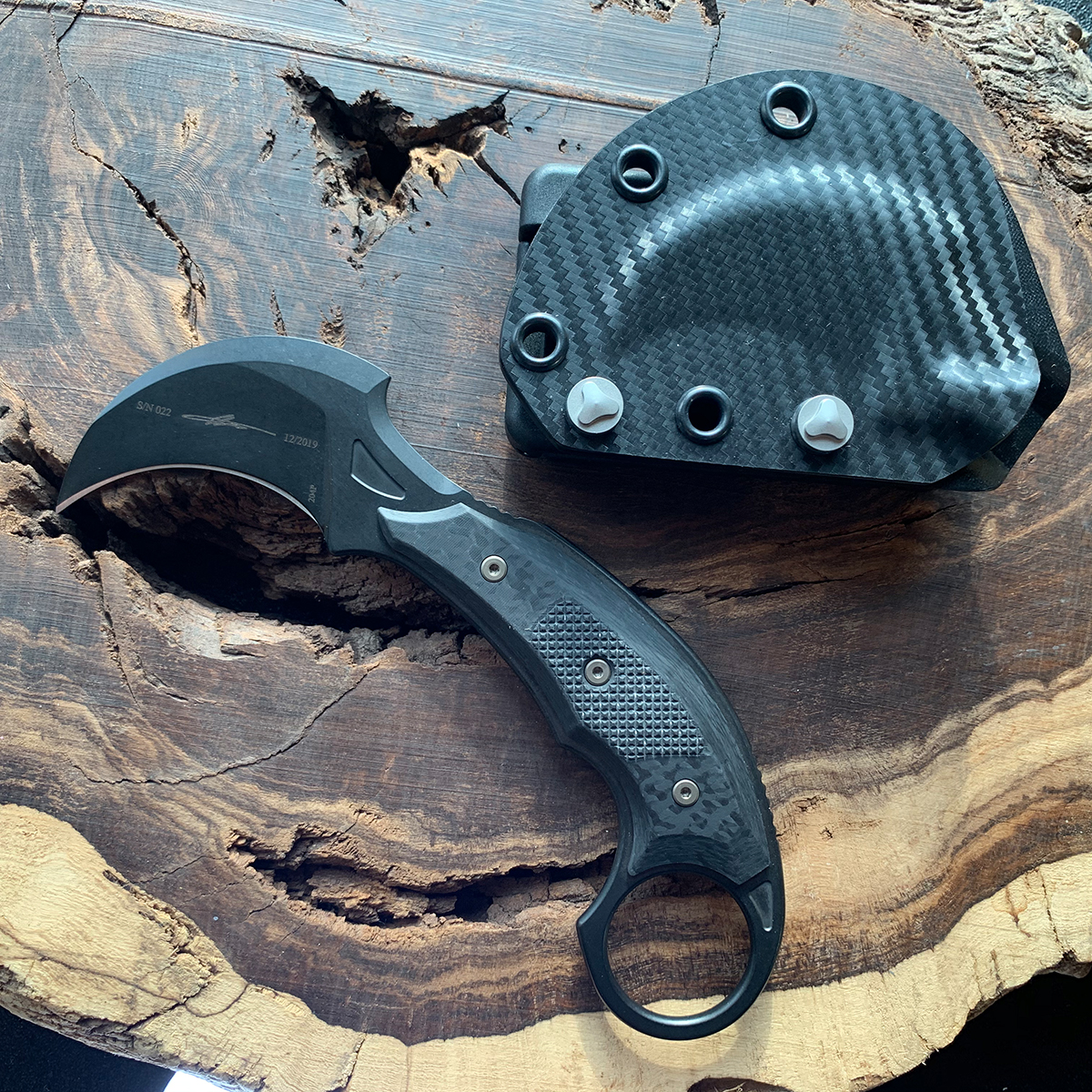 This model features carbon fiber handle scales on top of the one piece construction. Black DLC finished M390 stainless steel hawkbill blade. Bronze finished hardware. The blade has the model information, Microtech signature series logo, Bastinelli logo, serial number, and production date. Includes a carbon fiber wrapped Kydex sheath for right hand carry. Brand new in box.