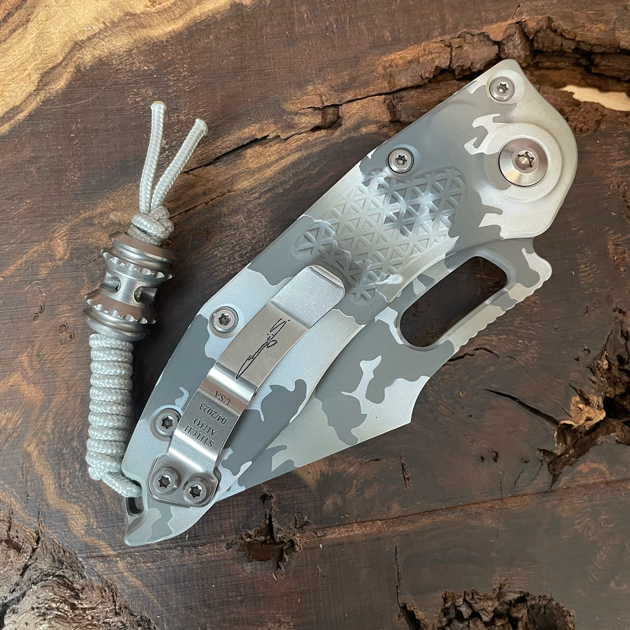 This model features Arctic Camo Cerakote 7075 aluminum handle scales with a milled texture. Matching cerakote finished M390 stainless steel spear point blade with fully serrated cutting edge. The clip is marked with the model info, production date, serial number and the signature series logo. Like new in box with lanyard and bead.