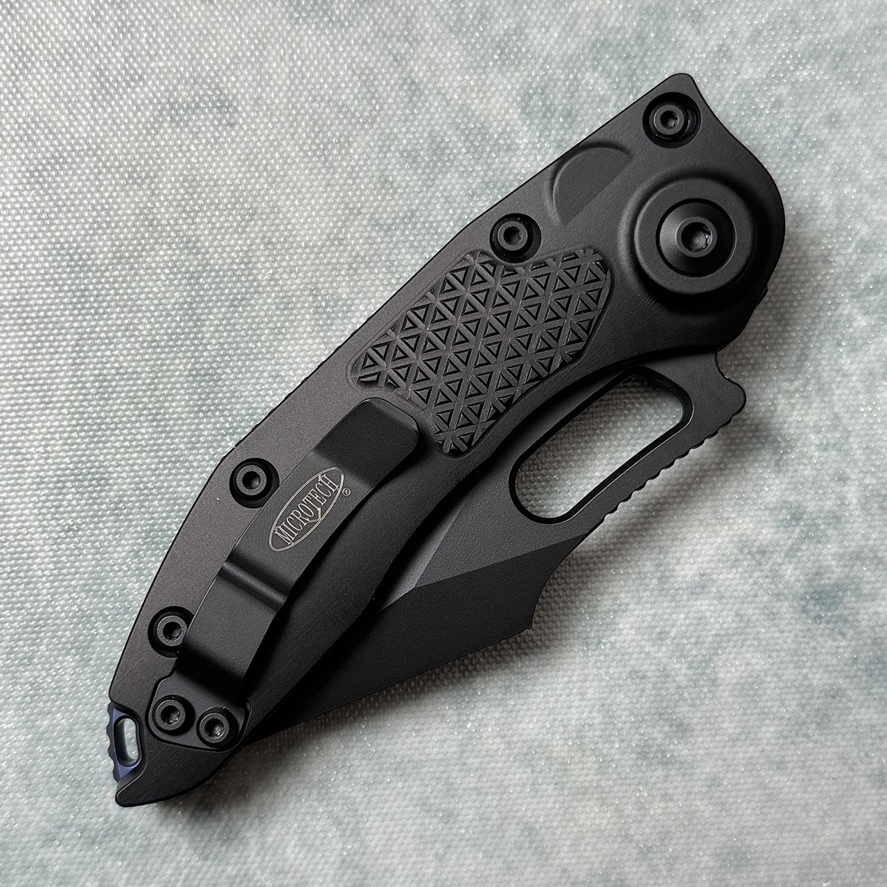 The M390 blade features an black tactical finish, flat grind, a nice big finger choil and jimping on the finger choil and thumb ramp for excellent grip. The handle is black Mil-Spec Hardcoat anodized aluminum alloy and features a heavily milled texture. The blue anodized titanium backspacer also features jimping. As you would expect this thing fires like a rocket and the lock up is rock solid, which is impressive on this big knife! All black finished hardware, pocket clip and lanyard hole. The blade is etched with the Microtech logo, Borka logo, and model information. The pocket clip also has the Microtech logo. Get one while they are available. Brand new in box.