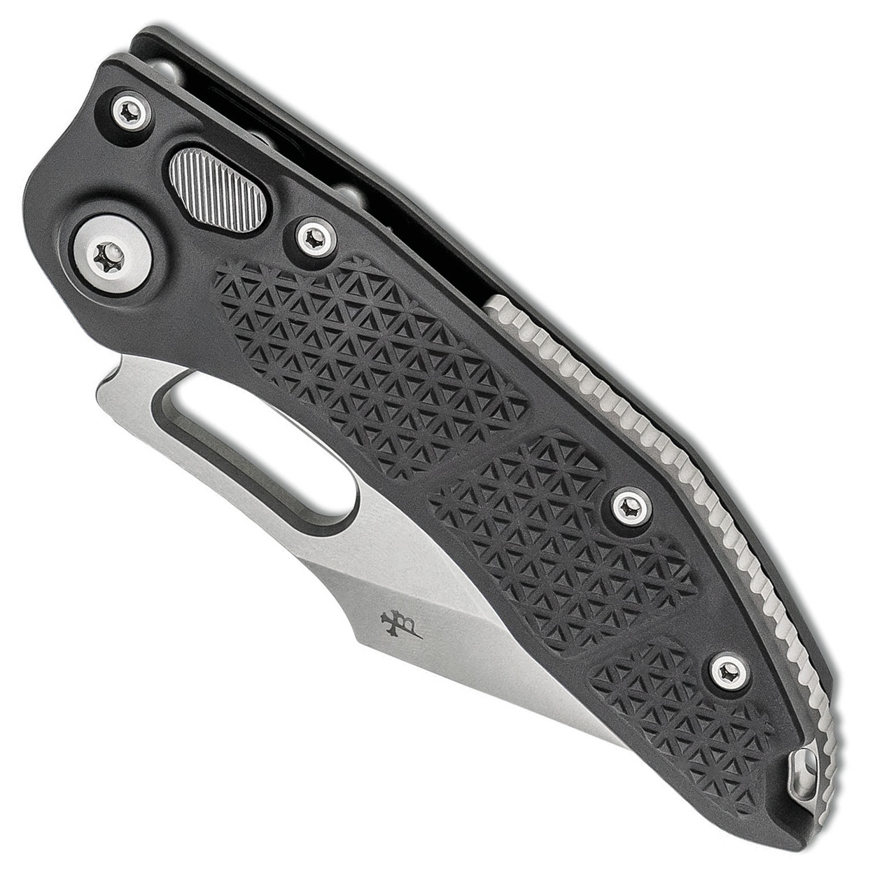 This model features black anodized aluminum handle scales. Stonewash finished M390 stainless steel spear point blade. Bead blast finished hardware and pocket clip. The blade is etched with the Microtech logo, Borka logo, and model information. The pocket clip also has the Microtech logo. Get one while they are available. Brand new in box.