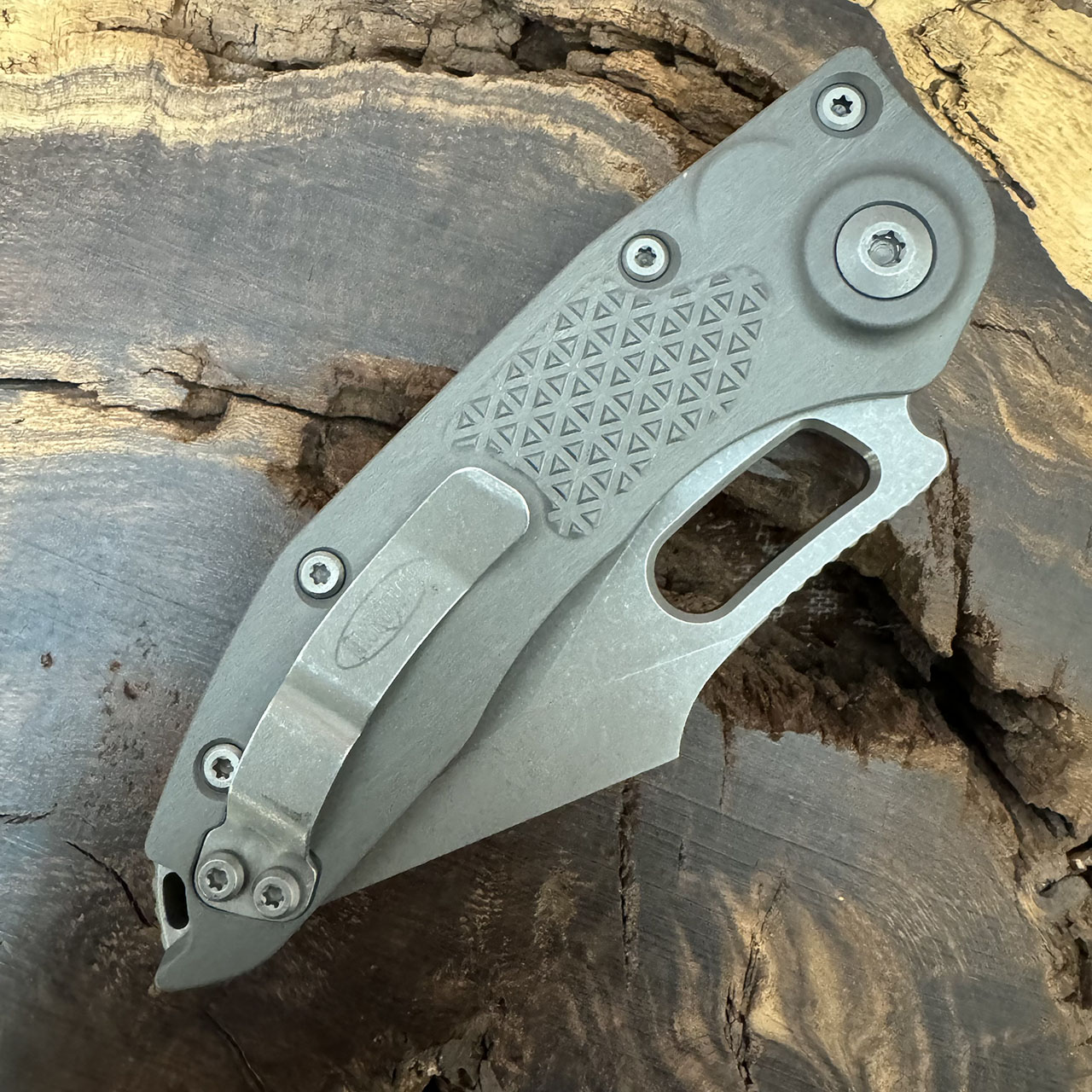 This model features clear natural anodized 7075 aluminum handle scales with a milled texture. Apocalyptic finished M390 stainless steel spear point patial serrated blade. All apocalyptic finished hardware and pocket clip. The blade is etched with the Microtech logo, Borka logo, and model information. The pocket clip also has the Microtech logo. Brand new in box.