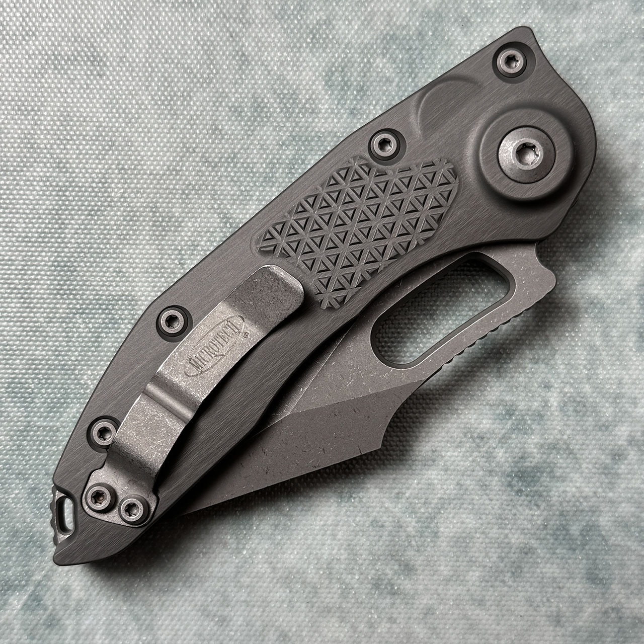 The M390 blade features an apocalyptic finish, full serrated edge, a nice big finger choil and jimping on the finger choil and thumb ramp for excellent grip. The handle is black Mil-Spec Hardcoat natural clear aluminum alloy and features a heavily milled texture. The aluminum backspacer also features jimping. As you would expect this thing fires like a rocket and the lock up is rock solid, which is impressive on this big knife! All bead blasted finished hardware, pocket clip and lanyard hole. The blade is etched with the Microtech logo, Borka logo, and model information. The pocket clip also has the Microtech logo. Brand new in box.