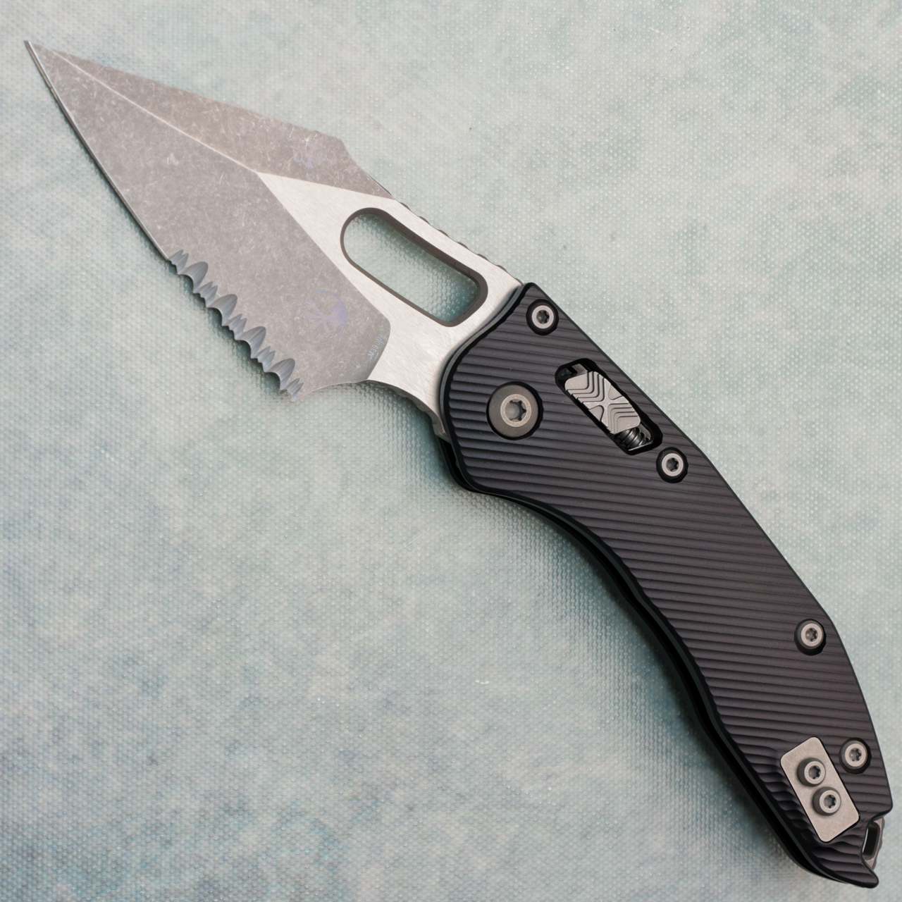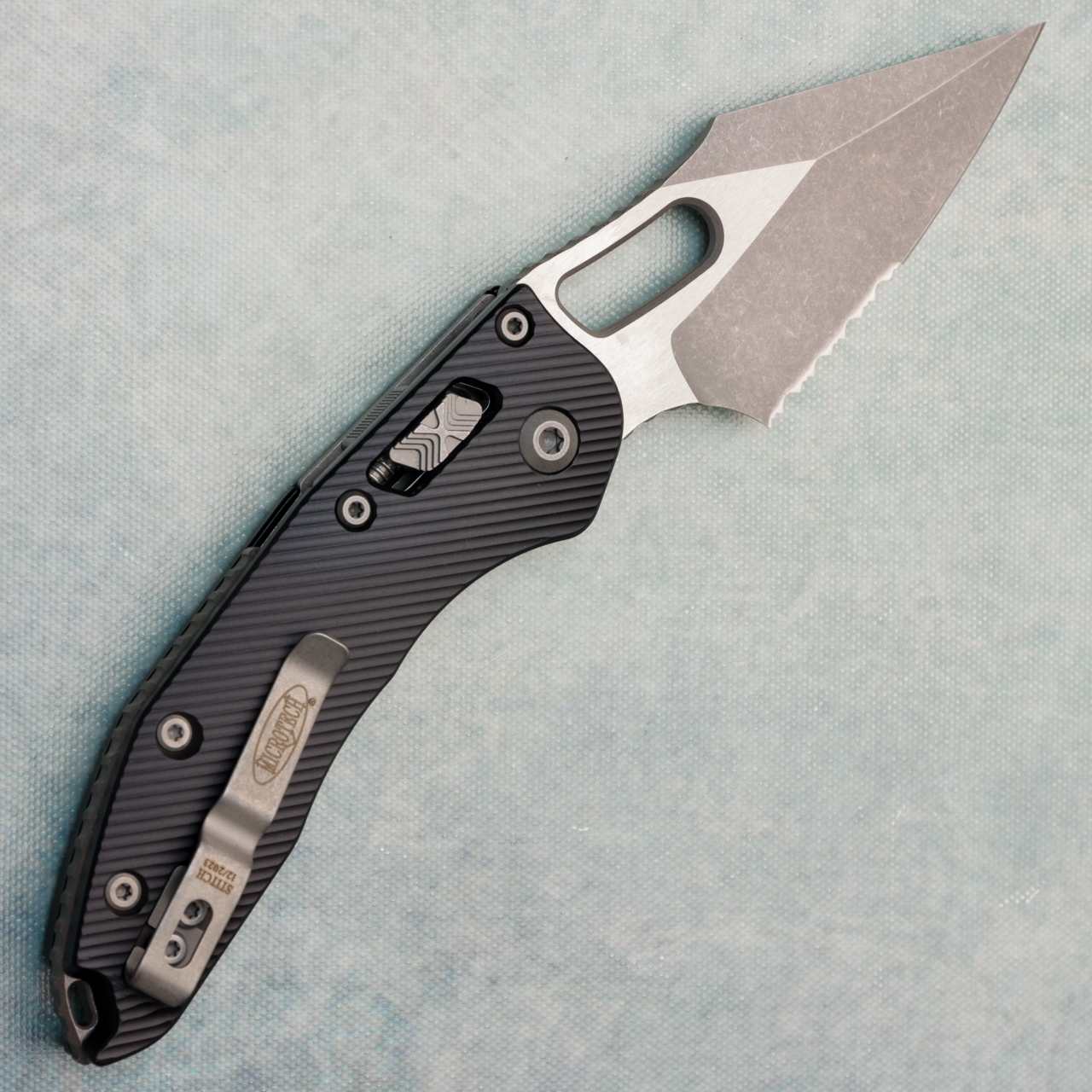 This model features fluted black aluminum handle scales. Apocalyptic finished M390MK stainless steel partially serrated blade, a nice big finger choil and jimping on the finger choil and thumb ramp for excellent grip. Apocalyptic finished hardware, reversible pocket clip, and lanyard hole. The pocket clip features the model info and production date. The blade features the Microtech and Borka logos. Very good condition, in box.