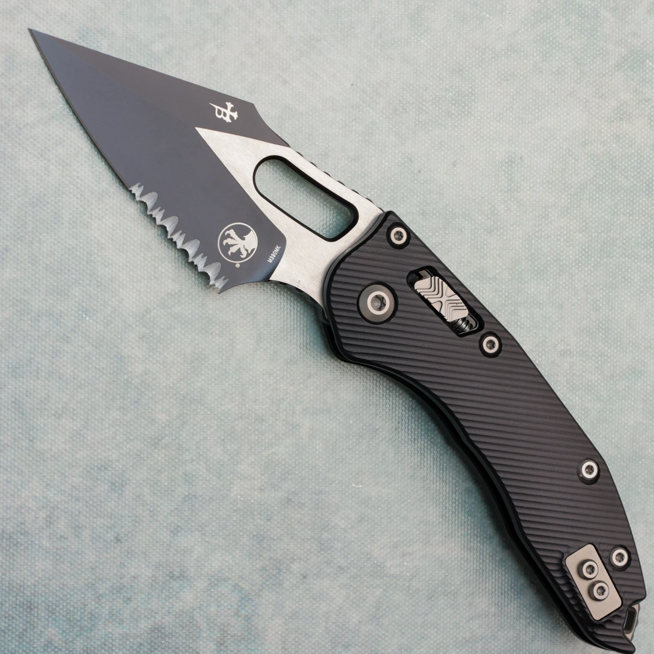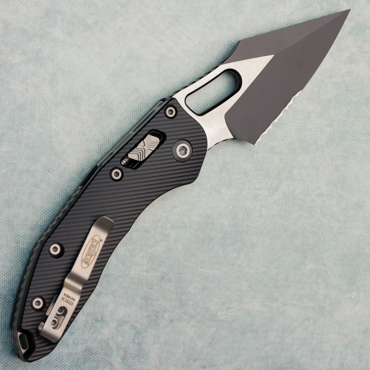This model features fluted black aluminum handle scales. Two-Tone Black finished M390MK stainless steel partially serrated blade, a nice big finger choil and jimping on the finger choil and thumb ramp for excellent grip. Satin finished hardware, reversible pocket clip, and lanyard hole. The pocket clip features the model info, Microtech logo, and production date. The blade features the Microtech claw and Borka logos. Very good condition, in box.