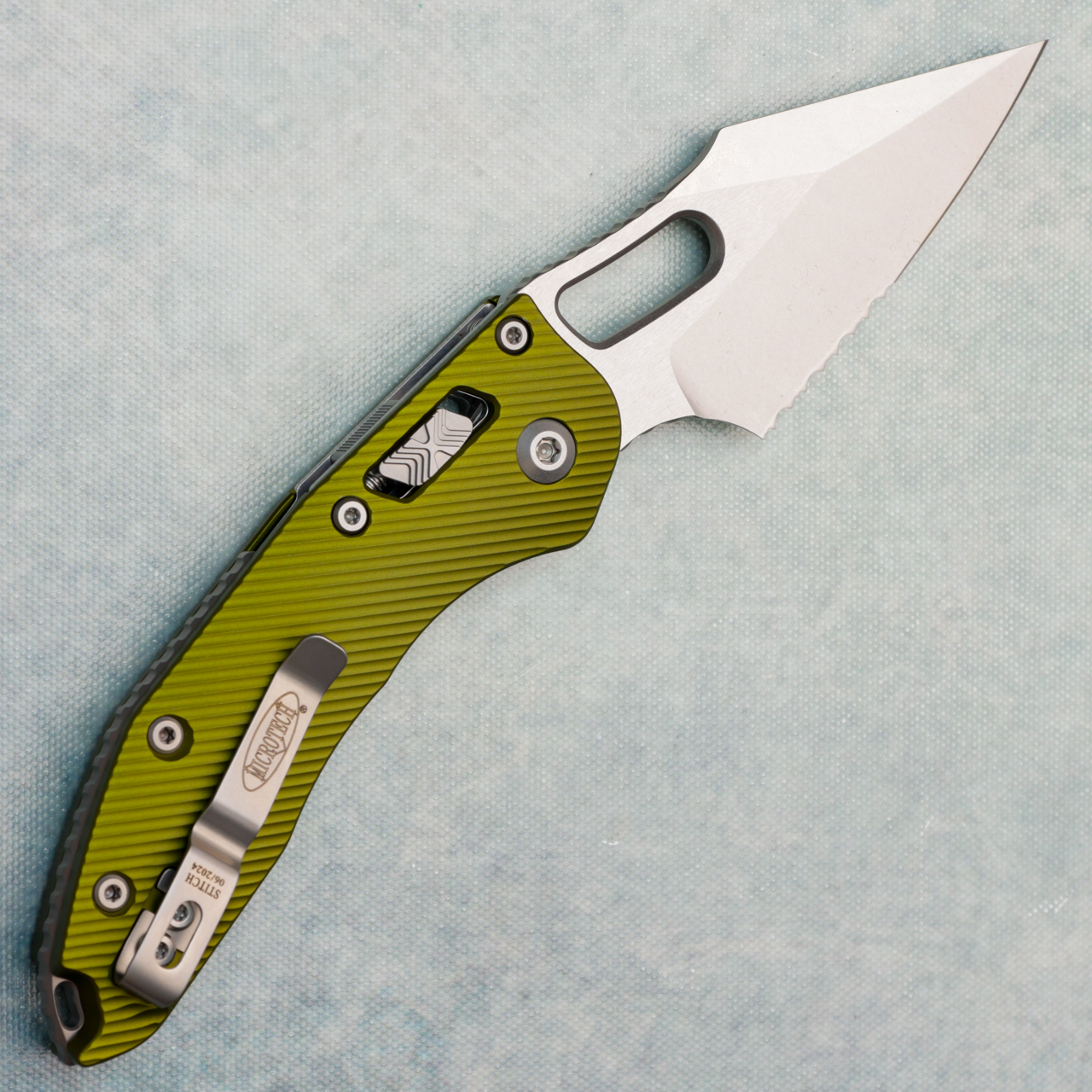 This model features fluted OD Green aluminum handle scales. Stonewash finished M390MK stainless steel partially serrated blade, a nice big finger choil and jimping on the finger choil and thumb ramp for excellent grip. Bead Blase finished hardware, reversible pocket clip, and lanyard hole. The pocket clip features the model info and production date. The blade features the Microtech and Borka logos. Very good condition, in box.