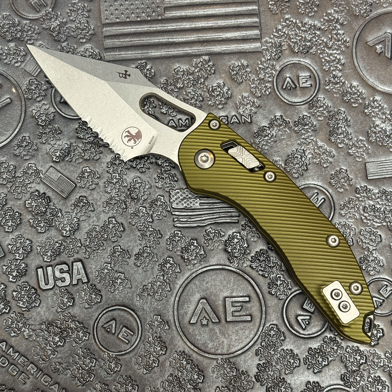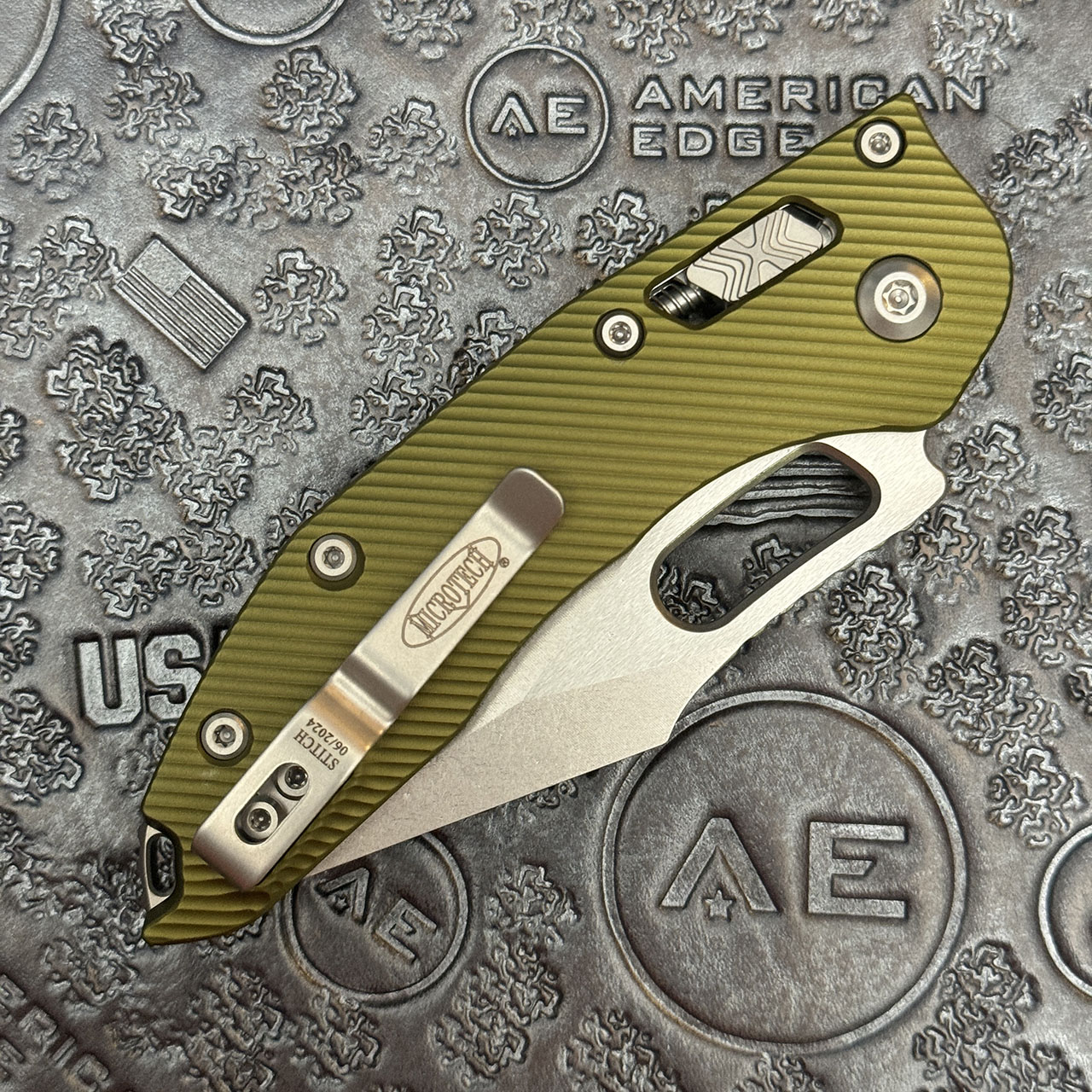 This model features fluted OD Green aluminum handle scales. Stonewash finished M390MK stainless steel partially serrated blade, a nice big finger choil and jimping on the finger choil and thumb ramp for excellent grip. Bead Blase finished hardware, reversible pocket clip, and lanyard hole. The pocket clip features the model info and production date. The blade features the Microtech and Borka logos. Brand new in box.