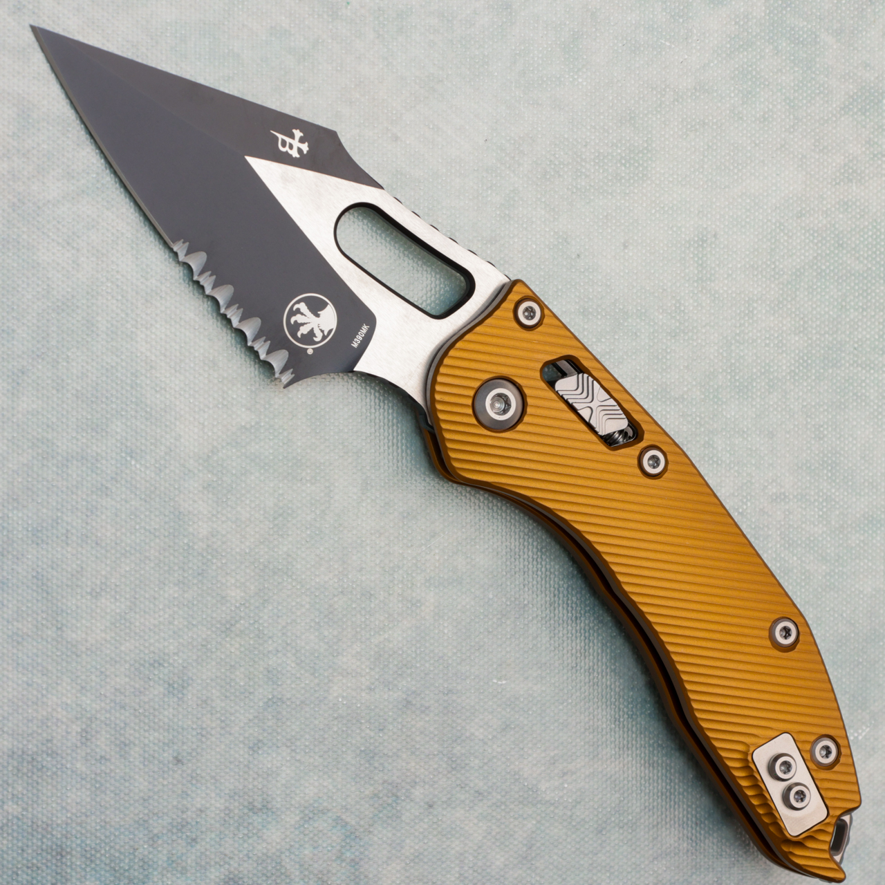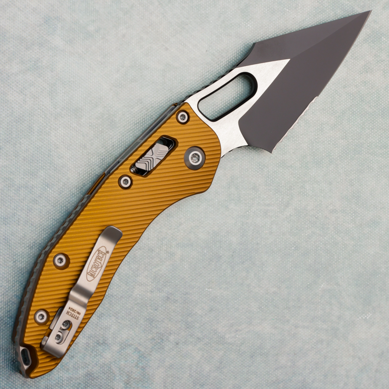 This model features fluted tan aluminum handle scales. Two-Tone Black finished M390MK stainless steel partially serrated blade, a nice big finger choil and jimping on the finger choil and thumb ramp for excellent grip. Satin finished hardware, reversible pocket clip, and lanyard hole. The pocket clip features the model info, Microtech logo, and production date. The blade features the Microtech claw and Borka logos. Very good condition, in box.